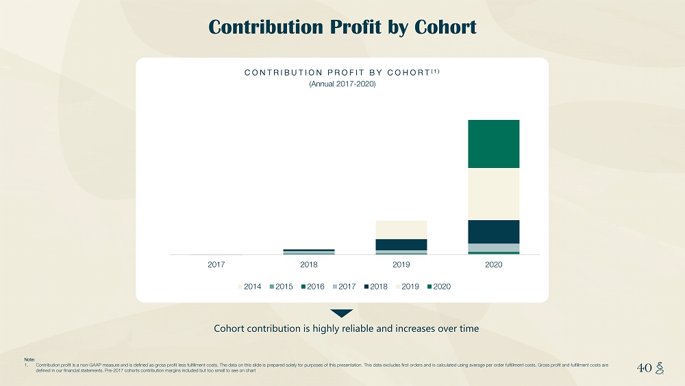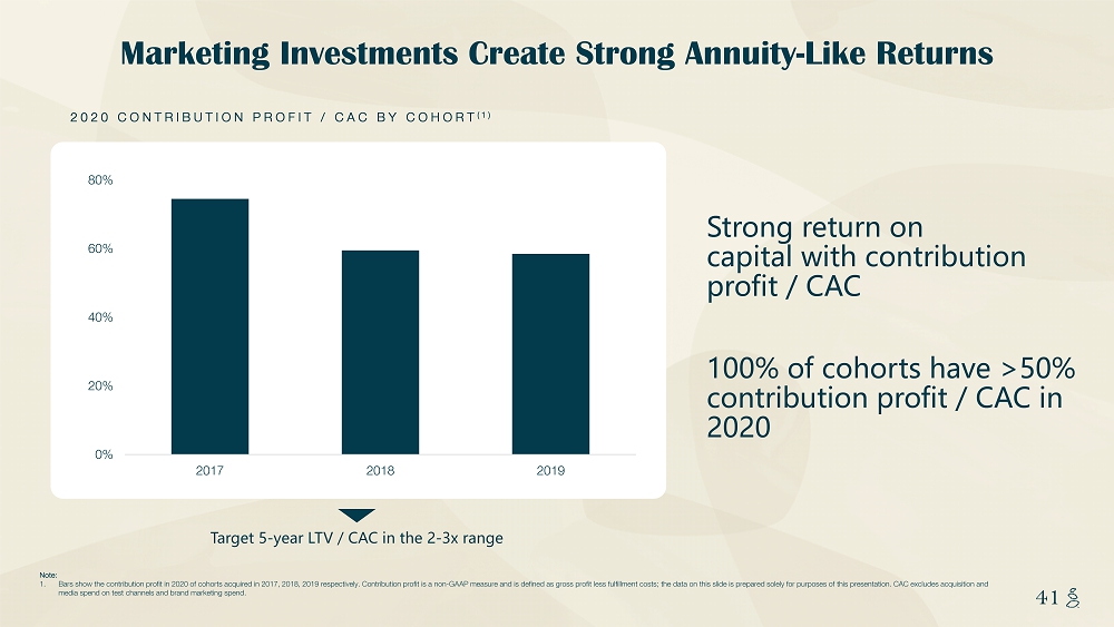 NOTES START FROM HERE AND GROW UP CONTENT BELOW THIS LINE CONTENT BELOW THIS LINE SUBTITLE BELOW THIS LINE TITLE CAN NOT GO ABOVE THIS LINE 40 40 Note: 1. Contribution profit is a non - GAAP measure and is defined as gross profit less fulfillment costs. The data on this slide is prepa red solely for purposes of this presentation. This data excludes first orders and is calculated using average per order fulfi llm ent costs. Gross profit and fulfillment costs are defined in our financial statements. Pre - 2017 cohorts contribution margins included but too small to see on chart Cohort contribution is highly reliable and increases over time CONTRIBUTION PROFIT BY COHORT (1) (Annual 2017 - 2020) $0 $20 $40 $60 $80 $100 2017 2018 2019 2020 2014 2015 2016 2017 2018 2019 2020 Contribution Profit by Cohort