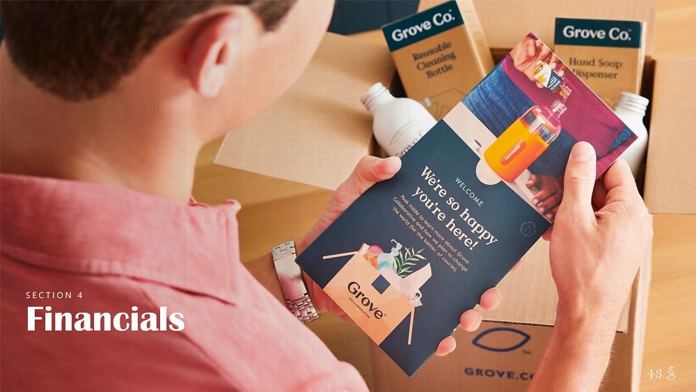 NOTES START FROM HERE AND GROW UP CONTENT BELOW THIS LINE CONTENT BELOW THIS LINE SUBTITLE BELOW THIS LINE TITLE CAN NOT GO ABOVE THIS LINE 42 42 Massive Addressable Retail Upside Retail Stores expansion SKU expansion MASSIVE OPPORTUNITY TO EXPAND SKU AND STORE COVERAGE OVER THE NEXT YEARS ~250,000 Total Retail stores in U.S. (1) 1,900 400 + Total Grove SKUs Today's coverage 22 Notes: 1. Total addressable retail stores in the U.S. as of 2020, based on Statista retail store research. Includes brick - and - mortar conve nience, grocery, club, mass, drug, natural and specialty stores. 2024 coverage Retail sales growth driven by: • Increasing retail doors + online penetration with existing partners • Growing assortment (SKUS / door) • Adding new online sales channels • Increasing velocity through brand awareness growth + innovation
