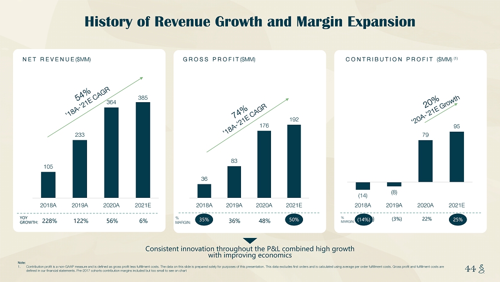 NOTES START FROM HERE AND GROW UP CONTENT BELOW THIS LINE CONTENT BELOW THIS LINE SUBTITLE BELOW THIS LINE TITLE CAN NOT GO ABOVE THIS LINE 44 44 NET REVENUE ($MM) History of Revenue Growth and Margin Expansion GROSS PROFIT ($MM) CONTRIBUTION PROFIT ($MM) (1) Consistent innovation throughout the P&L combined high growth with improving economics 228% 122% 56% 6 % YOY GROWTH: 35% 36% 48% 50 % % MARGIN: (14%) (3%) 22% 25 % % MARGIN: (14 %) 25 % Note: 1. Contribution profit is a non - GAAP measure and is defined as gross profit less fulfillment costs. The data on this slide is prepa red solely for purposes of this presentation. This data excludes first orders and is calculated using average per order fulfi llm ent costs. Gross profit and fulfillment costs are defined in our financial statements. Pre - 2017 cohorts contribution margins included but too small to see on chart 105 233 364 385 2018A 2019A 2020A 2021E 36 83 176 192 2018A 2019A 2020A 2021E (14) (8) 79 95 2018A 2019A 2020A 2021E