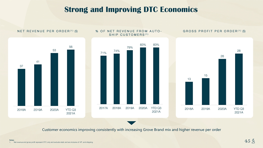 NOTES START FROM HERE AND GROW UP CONTENT BELOW THIS LINE CONTENT BELOW THIS LINE SUBTITLE BELOW THIS LINE TITLE CAN NOT GO ABOVE THIS LINE 45 45 Strong and Improving DTC Economics NET REVENUE PER ORDER (1) ($) Customer economics improving consistently with increasing Grove Brand mix and higher revenue per order Notes: 1. Net revenue and gross profit represent DTC only and exclude retail; and are inclusive of VIP, and shipping. % OF NET REVENUE FROM AUTO - SHIP CUSTOMERS (1) 71% 74% 79% 83% 83% 2017A 2018A 2019A 2020A YTD Q3 2021A GROSS PROFIT PER ORDER (1) ($) 37 41 53 56 2018A 2019A 2020A YTD Q3 2021A 13 15 26 28 2018A 2019A 2020A YTD Q3 2021A