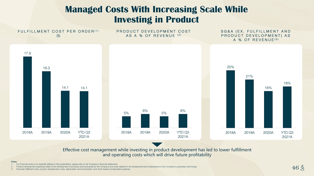 NOTES START FROM HERE AND GROW UP CONTENT BELOW THIS LINE CONTENT BELOW THIS LINE SUBTITLE BELOW THIS LINE TITLE CAN NOT GO ABOVE THIS LINE 46 46 FULFILLMENT COST PER ORDER (1) ($) PRODUCT DEVELOPMENT COST AS A % OF REVENUE (2) SG&A (EX. FULFILLMENT AND PRODUCT DEVELOPMENT) AS A % OF REVENUE (3) Managed Costs With Increasing Scale While Investing in Product Effective cost management while investing in product development has led to lower fulfillment and operating costs which will drive future profitability Notes: 1. For Financial metrics not explicitly defined in this presentation, please refer to the Company’s financial statements 2. Product development expenses relate to the development of products sold exclusively by the Company and costs related for the dev elopment and maintenance of the Company’s proprietary technology 3. Excludes fulfillment costs, product development costs, depreciation and amortization, and stock - based compensation expense 17.9 16.3 14.1 14.1 2018A 2019A 2020A YTD Q3 2021A 5% 6% 5% 6% 2018A 2019A 2020A YTD Q3 2021A 25% 21% 16% 18% 2018A 2019A 2020A YTD Q3 2021A