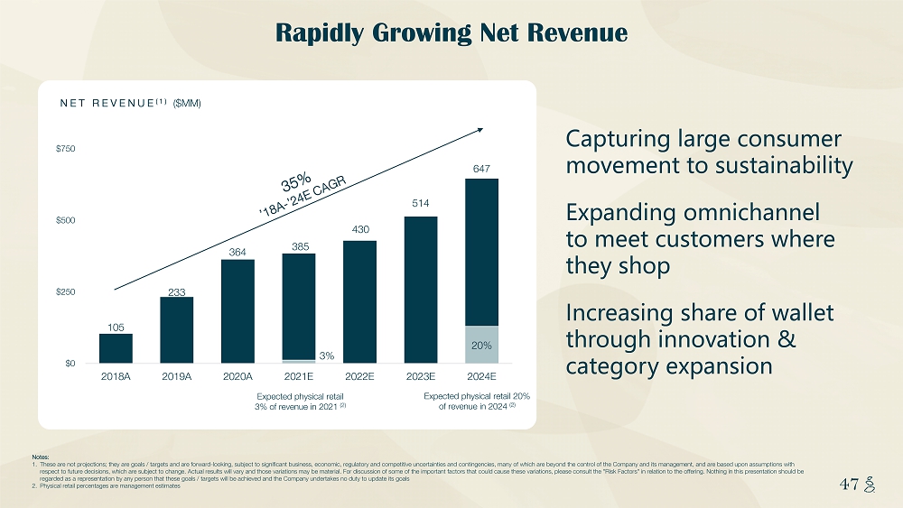 NOTES START FROM HERE AND GROW UP CONTENT BELOW THIS LINE CONTENT BELOW THIS LINE SUBTITLE BELOW THIS LINE TITLE CAN NOT GO ABOVE THIS LINE 47 47 Rapidly Growing Net Revenue Notes: 1. These are not projections; they are goals / targets and are forward - looking, subject to significant business, economic, regulato ry and competitive uncertainties and contingencies, many of which are beyond the control of the Company and its management, a nd are based upon assumptions with respect to future decisions, which are subject to change. Actual results will vary and those variations may be material. For dis cussion of some of the important factors that could cause these variations, please consult the "Risk Factors" in relation to the offering. Nothing in this presentation should be regarded as a representation by any person that these goals / targets will be achieved and the Company undertakes no duty to upd ate its goals 2. Physical retail percentages are management estimates Capturing large consumer movement to sustainability Expanding omnichannel to meet customers where they shop Increasing share of wallet through innovation & category expansion NET REVENUE (1) ($MM) Expected physical retail 3 % of revenue in 2021 (2) Expected physical retail 20 % of revenue in 2024 (2) 3% 20% 105 233 364 385 430 514 647 $0 $250 $500 $750 2018A 2019A 2020A 2021E 2022E 2023E 2024E