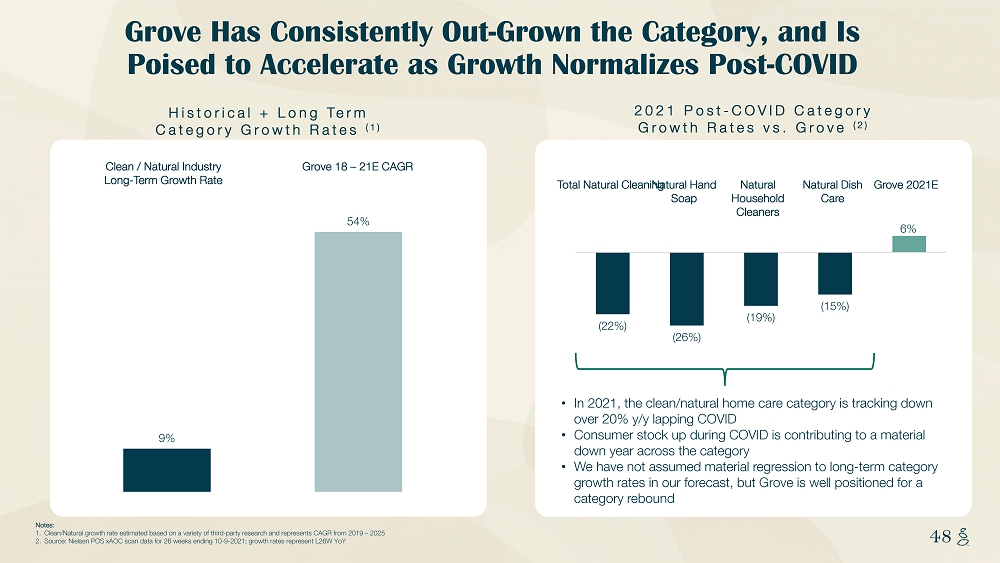 NOTES START FROM HERE AND GROW UP CONTENT BELOW THIS LINE CONTENT BELOW THIS LINE SUBTITLE BELOW THIS LINE TITLE CAN NOT GO ABOVE THIS LINE 48 48 Notes: 1. Clean/Natural growth rate estimated based on a variety of third - party research and represents CAGR from 2019 – 2025 2. Source: Nielsen POS xAOC scan data for 26 weeks ending 10 - 9 - 2021; growth rates represent L26W YoY Grove Has Consistently Out - Grown the Category, and Is Poised to Accelerate as Growth Normalizes Post - COVID Historical + Long Term Category Growth Rates (1 ) 2021 Post - COVID Category Growth Rates vs. Grove ( 2) • In 2021, the clean/natural home care category is tracking down over 20% y/y lapping COVID • Consumer stock up during COVID is contributing to a material down year across the category • We have not assumed material regression to long - term category growth rates in our forecast, but Grove is well positioned for a category rebound 9% 54% Clean / Natural Industry Long - Term Growth Rate Grove 18 – 21E CAGR Total Natural Cleaning Natural Hand Soap Natural Household Cleaners Natural Dish Care Grove 2021E (22%) (26%) (19%) (15%) 6% 2018A 2019A 2020A 2021E 2022E