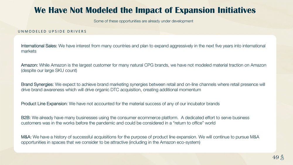 NOTES START FROM HERE AND GROW UP CONTENT BELOW THIS LINE CONTENT BELOW THIS LINE SUBTITLE BELOW THIS LINE TITLE CAN NOT GO ABOVE THIS LINE 49 49 We Have Not Modeled the Impact of Expansion Initiatives UNMODELED UPSIDE DRIVERS Some of these opportunities are already under development International Sales: We have interest from many countries and plan to expand aggressively in the next five years into international markets Amazon: While Amazon is the largest customer for many natural CPG brands, we have not modeled material traction on Amazon (despite our large SKU count) Brand Synergies : We expect to achieve brand marketing synergies between retail and on - line channels where retail presence will drive brand awareness which will drive organic DTC acquisition, creating additional momentum Product Line Expansion : We have not accounted for the material success of any of our incubator brands B2B: We already have many businesses using the consumer ecommerce platform. A dedicated effort to serve business customers was in the works before the pandemic and could be considered in a “return to office” world M&A: We have a history of successful acquisitions for the purpose of product line expansion. We will continue to pursue M&A opportunities in spaces that we consider to be attractive (including in the Amazon eco - system)