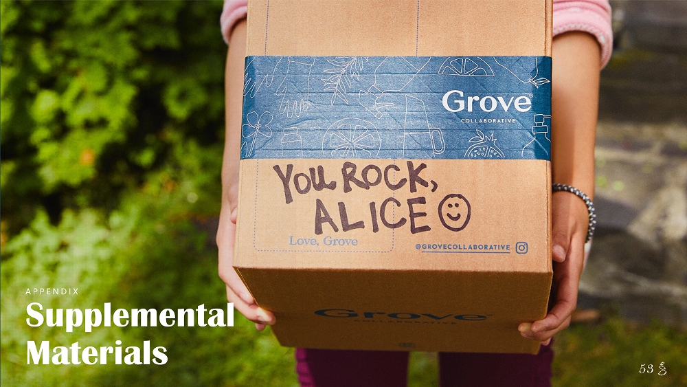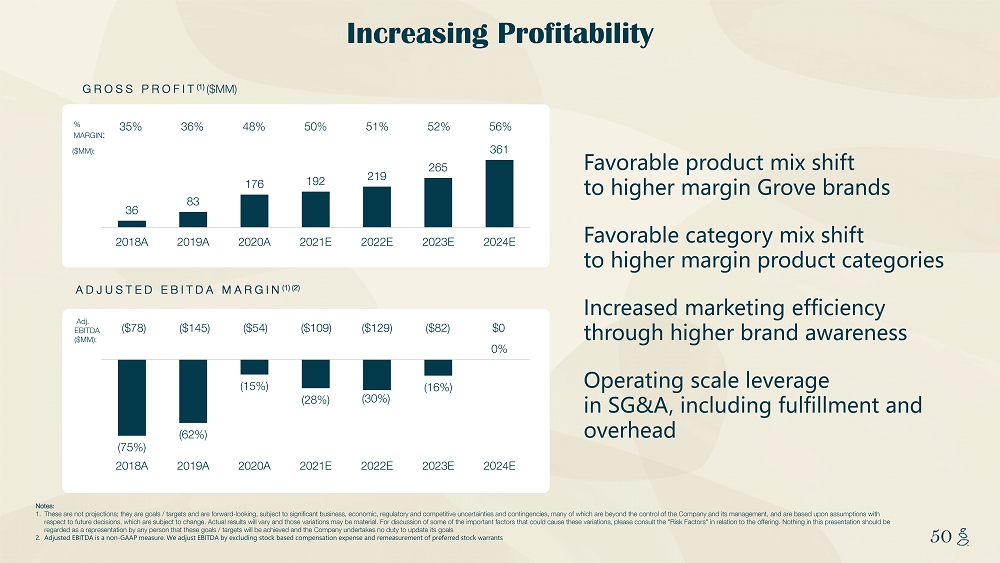 NOTES START FROM HERE AND GROW UP CONTENT BELOW THIS LINE CONTENT BELOW THIS LINE SUBTITLE BELOW THIS LINE TITLE CAN NOT GO ABOVE THIS LINE 50 50 Increasing Profitability Favorable product mix shift to higher margin Grove brands Favorable category mix shift to higher margin product categories Increased marketing efficiency through higher brand awareness Operating scale leverage in SG&A, including fulfillment and overhead GROSS PROFIT (1) ($MM) 36 83 176 192 219 265 361 2018A 2019A 2020A 2021E 2022E 2023E 2024E 36% 48% 50% 52% 56% 35% 51% % MARGIN : (75%) (62%) (15%) (28%) (30%) (16%) 0% 2018A 2019A 2020A 2021E 2022E 2023E 2024E ADJUSTED EBITDA MARGIN (1) (2) ($78) ($145) ($54) ($129) $0 ($82) ($109) Adj. EBITDA ($MM): Notes: 1. These are not projections; they are goals / targets and are forward - looking, subject to significant business, economic, regulato ry and competitive uncertainties and contingencies, many of which are beyond the control of the Company and its management, a nd are based upon assumptions with respect to future decisions, which are subject to change. Actual results will vary and those variations may be material. For dis cussion of some of the important factors that could cause these variations, please consult the "Risk Factors" in relation to the offering. Nothing in this presentation should be regarded as a representation by any person that these goals / targets will be achieved and the Company undertakes no duty to upd ate its goals 2. Adjusted EBITDA is a non - GAAP measure. We adjust EBITDA by excluding stock based compensation expense and remeasurement of prefe rred stock warrants ($MM):