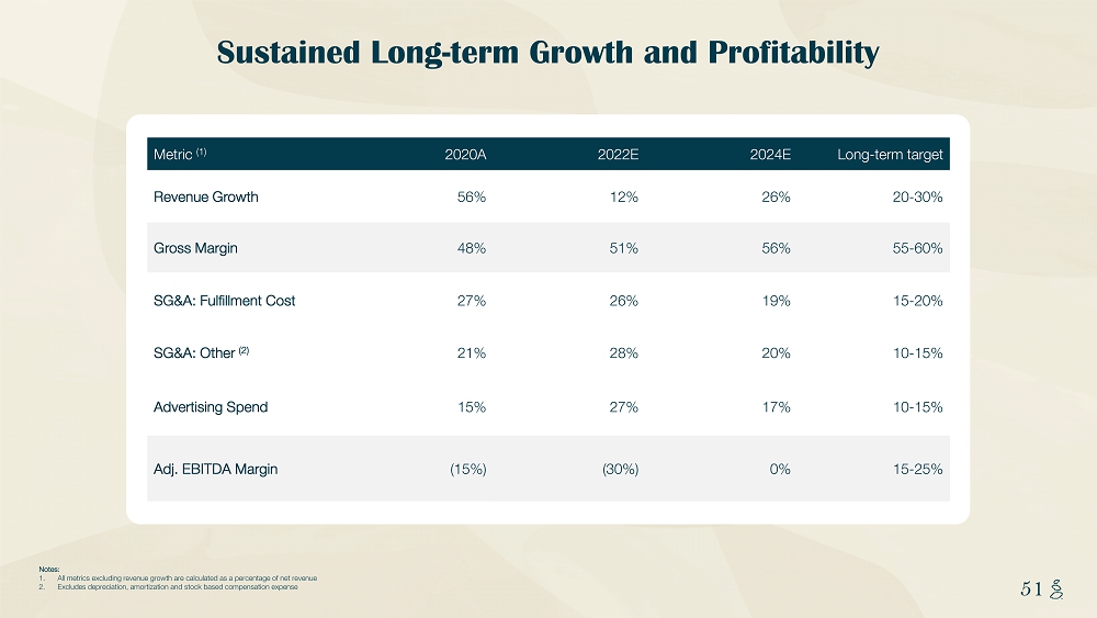 NOTES START FROM HERE AND GROW UP CONTENT BELOW THIS LINE CONTENT BELOW THIS LINE SUBTITLE BELOW THIS LINE TITLE CAN NOT GO ABOVE THIS LINE 51 51 Sustained Long - term Growth and Profitability Notes: 1. All metrics excluding revenue growth are calculated as a percentage of net revenue 2. Excludes depreciation, amortization and stock based compensation expense Metric (1) 2020A 2022E 2024E Long - term target Revenue Growth 56% 12% 26% 20 - 30% Gross Margin 48% 51% 56% 55 - 60% SG&A: Fulfillment Cost 27% 26% 19% 15 - 20% SG&A: Other (2) 21% 28% 20% 10 - 15% Advertising Spend 15% 27% 17% 10 - 15% Adj. EBITDA Margin (15%) (30%) 0% 15 - 25%