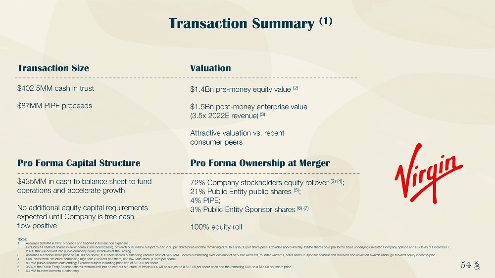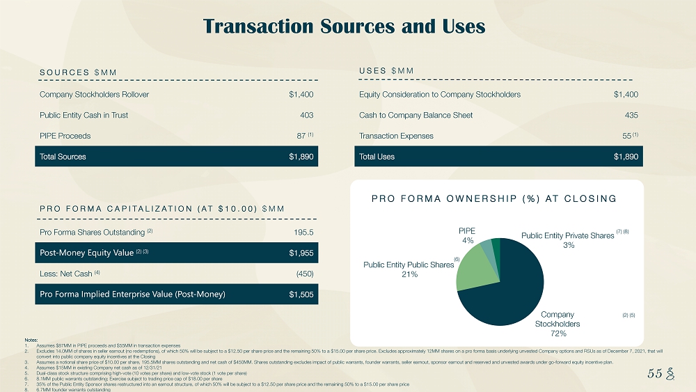 NOTES START FROM HERE AND GROW UP CONTENT BELOW THIS LINE CONTENT BELOW THIS LINE SUBTITLE BELOW THIS LINE TITLE CAN NOT GO ABOVE THIS LINE 54 54 Transaction Summary (1) Transaction Size Pro Forma Capital Structure Valuation Pro Forma Ownership at Merger Notes: 1. Assumes $87MM in PIPE proceeds and $55MM in transaction expenses 2. Excludes 14.0MM of shares in seller earnout (no redemptions), of which 50% will be subject to a $12.50 per share price and th e r emaining 50% to a $15.00 per share price. Excludes approximately 12MM shares on a pro forma basis underlying unvested Company op tions and RSUs as of December 7, 2021, that will convert into public company equity incentives at the Closing 3. Assumes a notional share price of $10.00 per share, 195.5MM shares outstanding and net cash of $450MM. Shares outstanding exc lud es impact of public warrants, founder warrants, seller earnout, sponsor earnout and reserved and unvested awards under go - forwar d equity incentive plan. 4. Dual - class stock structure comprising high - vote (10 votes per share) and low - vote stock (1 vote per share) 5. 8.1MM public warrants outstanding; Exercise subject to trading price cap of $18.00 per share 6. 35% of the Public Entity Sponsor shares restructured into an earnout structure, of which 50% will be subject to a $12.50 per sha re price and the remaining 50% to a $15.00 per share price 7. 6.7MM founder warrants outstanding $402.5MM cash in trust $87MM PIPE proceeds $1.4Bn pre - money equity value (2) $1.5Bn post - money enterprise value (3.5x 2022E revenue) (3) Attractive valuation vs. recent consumer peers $435MM in cash to balance sheet to fund operations and accelerate growth No additional equity capital requirements expected until Company is free cash flow positive 72% Company stockholders equity rollover (2) (4) ; 21% Public Entity public shares (5) ; 4% PIPE; 3% Public Entity Sponsor shares (6) (7) 100% equity roll