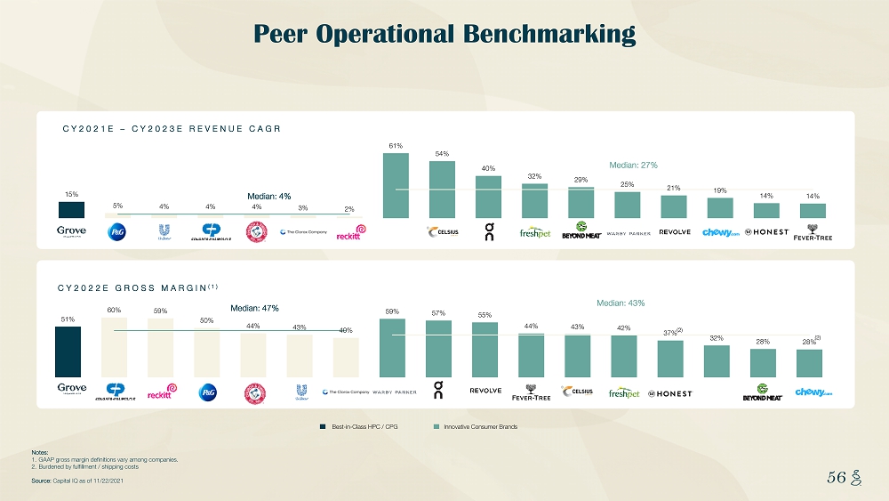 NOTES START FROM HERE AND GROW UP CONTENT BELOW THIS LINE CONTENT BELOW THIS LINE SUBTITLE BELOW THIS LINE TITLE CAN NOT GO ABOVE THIS LINE 56 56 Peer Operational Benchmarking Notes: 1. GAAP gross margin definitions vary among companies. 2. Burdened by fulfillment / shipping costs Source: Capital IQ as of 11/22/2021 CY2022E GROSS MARGIN (1) CY2021E – CY2023E REVENUE CAGR Best - in - Class HPC / CPG Innovative Consumer Brands (2) (2) 51% 60% 59% 50% 44% 43% 40% 59% 57% 55% 44% 43% 42% 37% 32% 28% 28% Median: 47% Median: 43% 15% 5% 4% 4% 4% 3% 2% 61% 54% 40% 32% 29% 25% 21% 19% 14% 14% Median: 4% Median: 27%