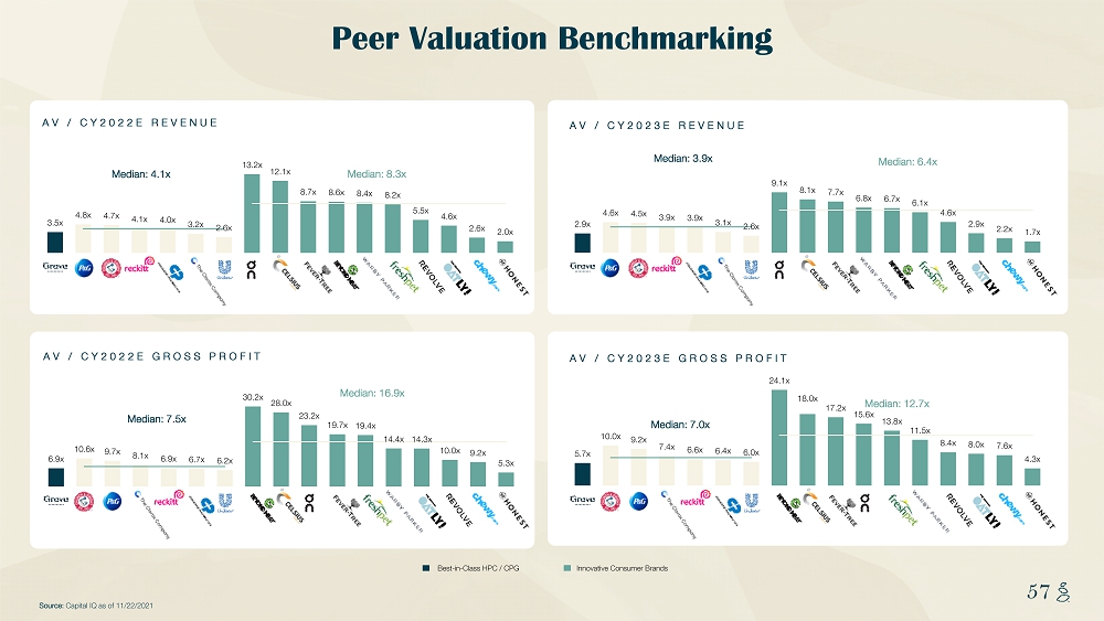 NOTES START FROM HERE AND GROW UP CONTENT BELOW THIS LINE CONTENT BELOW THIS LINE SUBTITLE BELOW THIS LINE TITLE CAN NOT GO ABOVE THIS LINE 57 57 Peer Valuation Benchmarking Source: Capital IQ as of 11/22/2021 Best - in - Class HPC / CPG Innovative Consumer Brands AV / CY2023E REVENUE AV / CY2022E REVENUE AV / CY2022E GROSS PROFIT AV / CY2023E GROSS PROFIT 3.5x 4.8x 4.7x 4.1x 4.0x 3.2x 2.6x 13.2x 12.1x 8.7x 8.6x 8.4x 8.2x 5.5x 4.6x 2.6x 2.0x Median: 4.1x Median: 8.3x 2.9x 4.6x 4.5x 3.9x 3.9x 3.1x 2.6x 9.1x 8.1x 7.7x 6.8x 6.7x 6.1x 4.6x 2.9x 2.2x 1.7x Median: 3.9x Median: 6.4x 6.9x 10.6x 9.7x 8.1x 6.9x 6.7x 6.2x 30.2x 28.0x 23.2x 19.7x 19.4x 14.4x 14.3x 10.0x 9.2x 5.3x Median: 7.5x Median: 16.9x 5.7x 10.0x 9.2x 7.4x 6.6x 6.4x 6.0x 24.1x 18.0x 17.2x 15.6x 13.8x 11.5x 8.4x 8.0x 7.6x 4.3x Median: 7.0x Median: 12.7x
