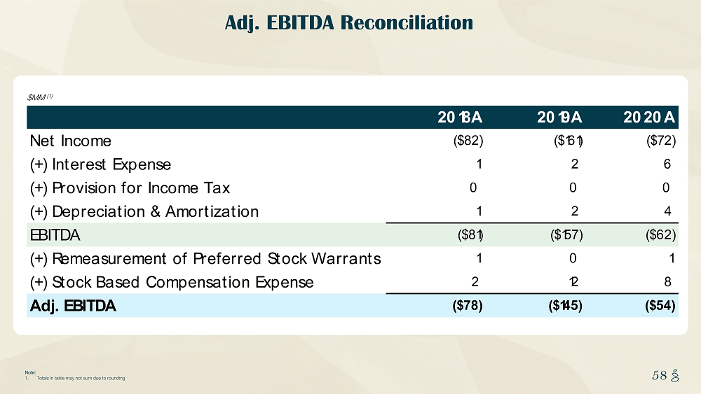 NOTES START FROM HERE AND GROW UP CONTENT BELOW THIS LINE CONTENT BELOW THIS LINE SUBTITLE BELOW THIS LINE TITLE CAN NOT GO ABOVE THIS LINE 58 58 Adj. EBITDA Reconciliation $MM (1) Note: 1. Totals in table may not sum due to rounding 2018A 2019A 2020A Net Income ($82) ($161) ($72) (+) Interest Expense 1 2 6 (+) Provision for Income Tax 0 0 0 (+) Depreciation & Amortization 1 2 4 EBITDA ($81) ($157) ($62) (+) Remeasurement of Preferred Stock Warrants 1 0 1 (+) Stock Based Compensation Expense 2 12 8 Adj. EBITDA ($78) ($145) ($54)