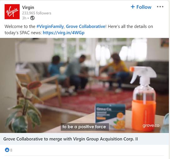 In connection with the business combination, Virgin Group Acquisition Corp. II (“VGAC II”) intends to file with the Securities and Exchange Commission (“SEC”) a registration statement on Form S-4 containing a preliminary proxy statement and a preliminary prospectus of VGAC II, and after the registration statement is declared effective, VGAC II will mail a definitive proxy statement/prospectus relating to the business combination to its shareholders. This communication does not contain all the information that should be considered concerning the business combination and is not intended to form the basis of any investment decision or any other decision in respect of the business combination. VGAC II’s shareholders and other interested persons are advised to read, when available, the preliminary proxy statement/prospectus and the amendments thereto and the definitive proxy statement/prospectus and other documents filed in connection with the business combination, as these materials will contain important information about Grove Collaborative, Inc. (“Grove”), VGAC II and the business combination. When available, the definitive proxy statement/prospectus and other relevant materials for the business combination will be mailed to shareholders of VGAC II as of a record date to be established for voting on the business combination. Such shareholders will also be able to obtain copies of the preliminary proxy statement/prospectus, the definitive proxy statement/prospectus and other documents filed with the SEC, without charge, once available, at the SEC’s website at www.sec.gov, or by directing a request to Virgin Group Acquisition Corp. II, 65 Bleecker Street, 6th Floor, New York, New York 10012.