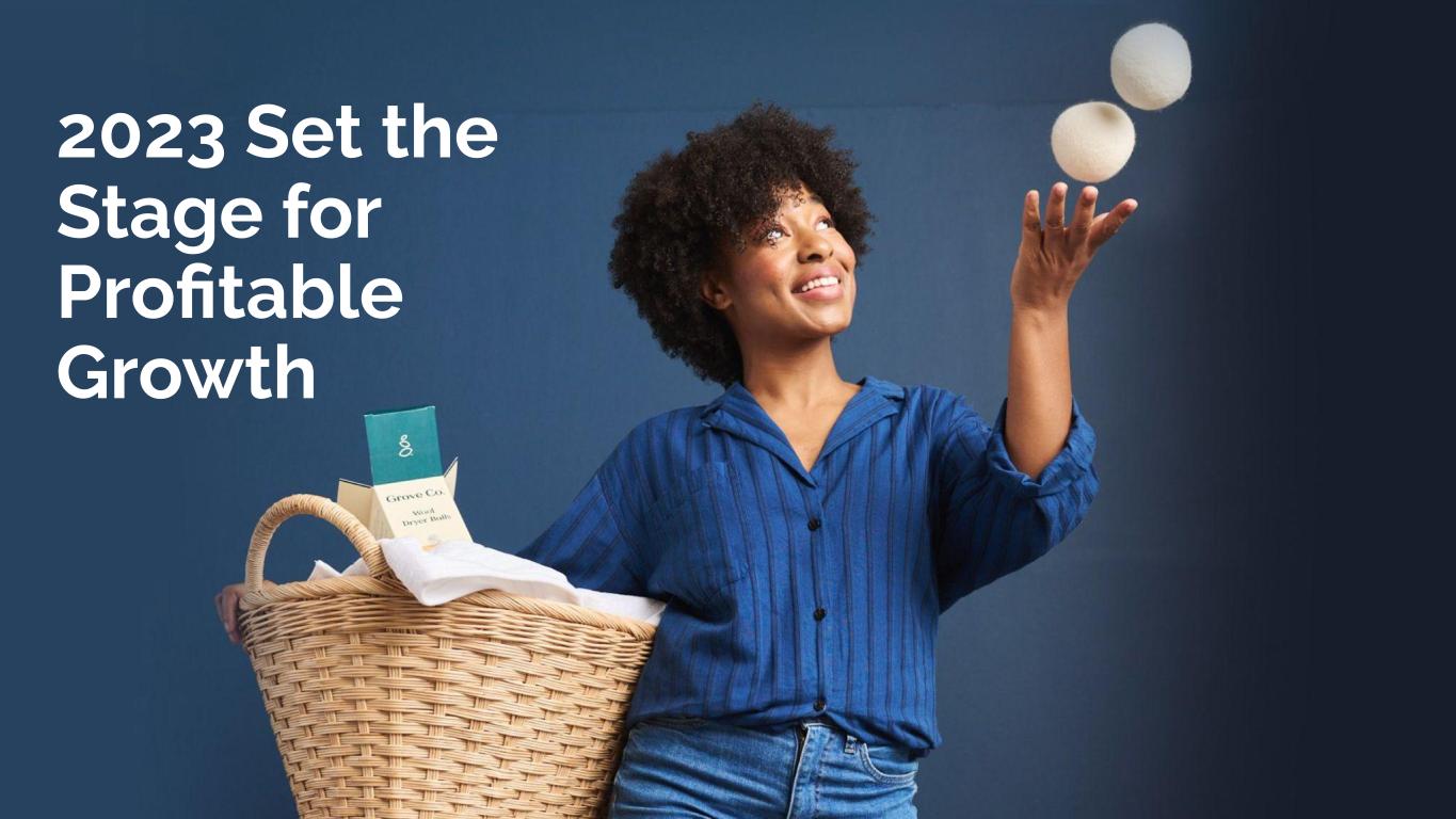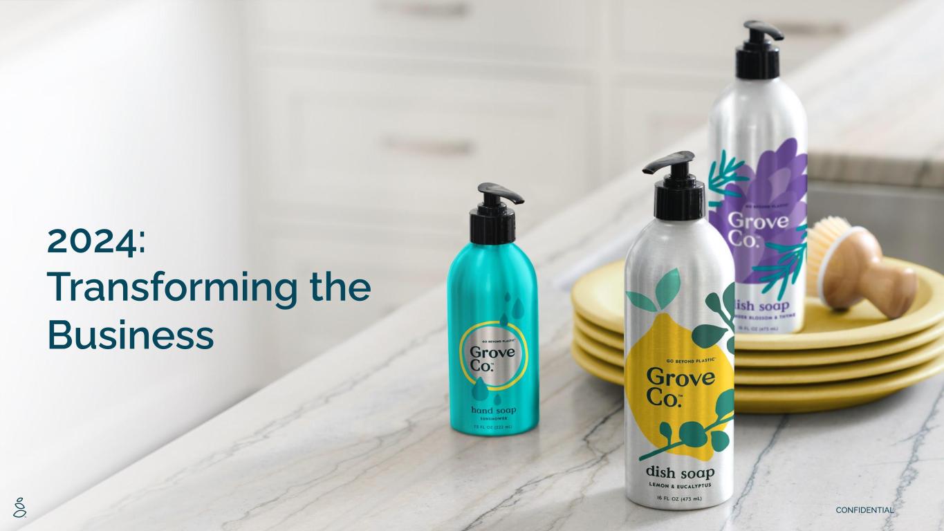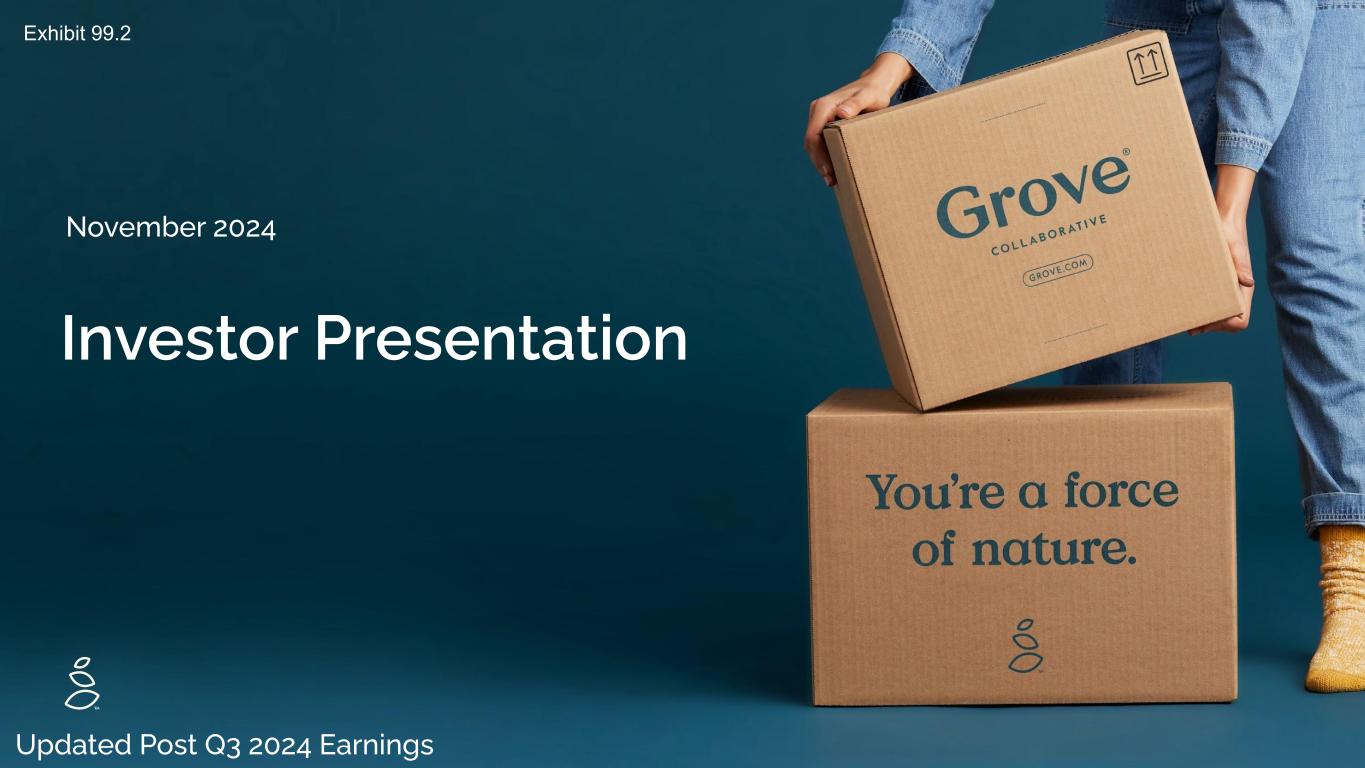 NOTES START FROM HERE AND GROW UP NO CONTENT BELOW THIS LINE CONTENT BELOW THIS LINE SUBTITLE BELOW THIS LINE TITLE CAN NOT GO ABOVE THIS LINE 3 59 76 0 114 88 120 159 144 130 186 128 102 163 157 172 196 200 255 255 255 0 0 0 247 243 228 3 59 76 247 243 228 2 Forward-Looking Statements Certain statements included in this presentation are forward-looking statements for purposes of the safe harbor provisions under the United States Private Securities Litigation Reform Act of 1995. Forward-looking statements are statements other than statements about historical fact. The forward looking statements in this presentation include, but are not limited to, statements regarding sequential revenue growth in the fourth quarter of 2024, adjusted EBITDA profitability for 2024, revenue and adjusted EBITDA expectations for 2024, being term debt free heading into 2025, Shopify replatforming expected completion by the first quarter of 2025, future SKU count, future average order value, future addition of products and opportunity for expansion, wellness as a next generation shopping occasion, unit economic growth, customer experience transformation, continuing momentum in VMS and the impact of customer experience changes. These forward-looking statements are subject to a number of risks and uncertainties, and you should not rely upon the forward-looking statements as predictions of future events. The future events and trends discussed in this presentation may not occur and actual results could differ materially and adversely from those anticipated or implied in the forward-looking statements. Grove cannot guarantee that future results, levels of activity, performance, achievements or events and circumstances reflected in the forward-looking statements will occur. Except as required by law, Grove disclaims any obligation to update these forward-looking statements to reflect future events or circumstances. The forward-looking statements are subject to a number of risks and uncertainties, including: changes in business, market, financial, political and legal conditions; risks relating to the uncertainty of the projected financial information; Grove’s ability to successfully expand its business; competition; the uncertain effects of the COVID-19 pandemic; risks relating to growing inflation and rising interest rates; and those factors discussed in documents of Grove filed, or to be filed, with the U.S. Securities and Exchange Commission. If any of these risks materialize or our assumptions prove incorrect, actual results could differ materially from the results implied by these forward-looking statements. These forward-looking statements should not be relied upon as representing Grove’s assessments as of any date subsequent to the date of this presentation. Non-GAAP Information Grove uses certain non-GAAP measures in this presentation including Adjusted EBITDA. Grove believes the presentation of its non-GAAP financial measures enhances investors' overall understanding of the company's historical financial performance. The presentation of the company's non-GAAP financial measures is not meant to be considered in isolation or as a substitute for the company's financial results prepared in accordance with GAAP, and the company's non-GAAP measures may be different from non-GAAP measures used by other companies. Reconciliations of these non-GAAP financial measures to the most comparable GAAP measures, may be found in the Supplemental Materials at the end of this presentation. Safe Harbor Statement/Non-GAAP Measures