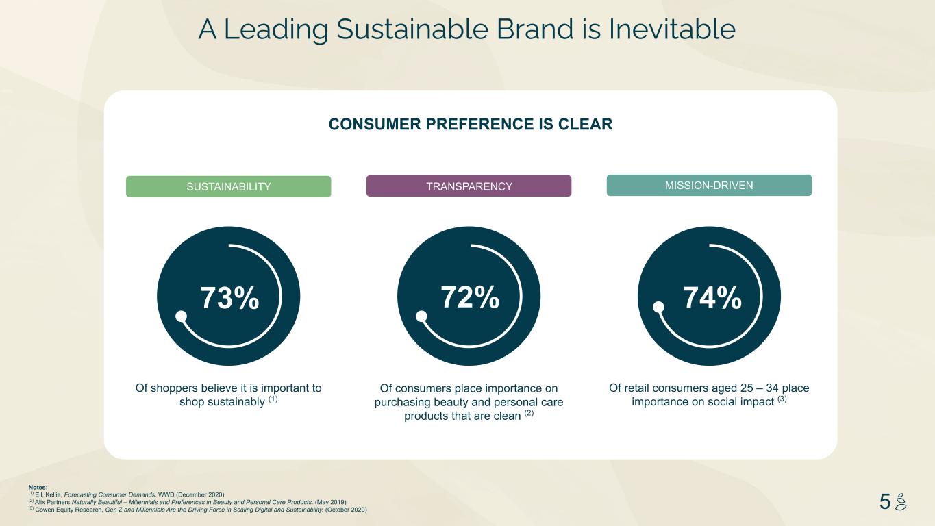 NOTES START FROM HERE AND GROW UP NO CONTENT BELOW THIS LINE CONTENT BELOW THIS LINE SUBTITLE BELOW THIS LINE TITLE CAN NOT GO ABOVE THIS LINE 3 59 76 0 114 88 120 159 144 130 186 128 102 163 157 172 196 200 255 255 255 0 0 0 247 243 228 3 59 76 247 243 228 5 A Leading Sustainable Brand is Inevitable Notes: (1) Ell, Kellie, Forecasting Consumer Demands. WWD (December 2020) (2) Alix Partners Naturally Beautiful – Millennials and Preferences in Beauty and Personal Care Products. (May 2019) (3) Cowen Equity Research, Gen Z and Millennials Are the Driving Force in Scaling Digital and Sustainability. (October 2020) Of retail consumers aged 25 – 34 place importance on social impact (3) Of consumers place importance on purchasing beauty and personal care products that are clean (2) TRANSPARENCY Of shoppers believe it is important to shop sustainably (1) SUSTAINABILITY CONSUMER PREFERENCE IS CLEAR MISSION-DRIVEN 74%72%73%