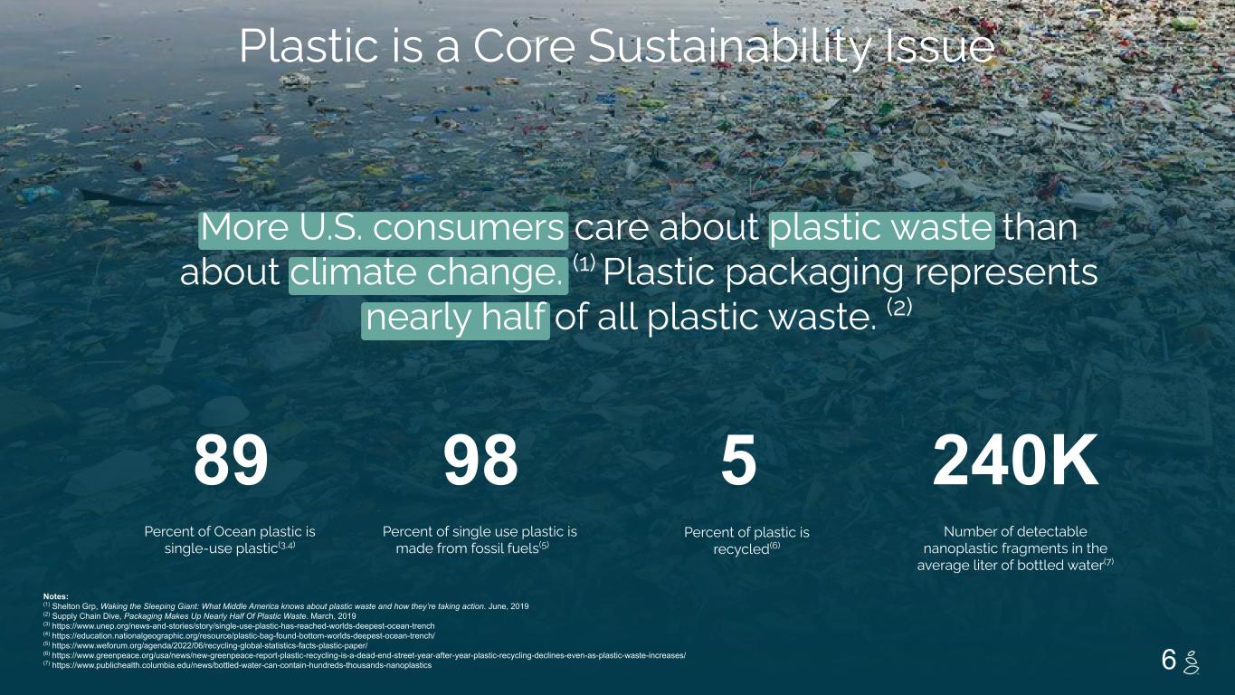 NOTES START FROM HERE AND GROW UP NO CONTENT BELOW THIS LINE CONTENT BELOW THIS LINE SUBTITLE BELOW THIS LINE TITLE CAN NOT GO ABOVE THIS LINE 3 59 76 0 114 88 120 159 144 130 186 128 102 163 157 172 196 200 255 255 255 0 0 0 247 243 228 3 59 76 247 243 228 6 Percent of single use plastic is made from fossil fuels(5) Percent of Ocean plastic is single-use plastic(3,4) Number of detectable nanoplastic fragments in the average liter of bottled water(7) Percent of plastic is recycled(6) Notes: (1) Shelton Grp, Waking the Sleeping Giant: What Middle America knows about plastic waste and how they’re taking action. June, 2019 (2) Supply Chain Dive, Packaging Makes Up Nearly Half Of Plastic Waste. March, 2019 (3) https://www.unep.org/news-and-stories/story/single-use-plastic-has-reached-worlds-deepest-ocean-trench (4) https://education.nationalgeographic.org/resource/plastic-bag-found-bottom-worlds-deepest-ocean-trench/ (5) https://www.weforum.org/agenda/2022/06/recycling-global-statistics-facts-plastic-paper/ (6) https://www.greenpeace.org/usa/news/new-greenpeace-report-plastic-recycling-is-a-dead-end-street-year-after-year-plastic-recycling-declines-even-as-plastic-waste-increases/ (7) https://www.publichealth.columbia.edu/news/bottled-water-can-contain-hundreds-thousands-nanoplastics 89 98 5 240K More U.S. consumers care about plastic waste than about climate change. (1) Plastic packaging represents nearly half of all plastic waste. (2) Plastic is a Core Sustainability Issue