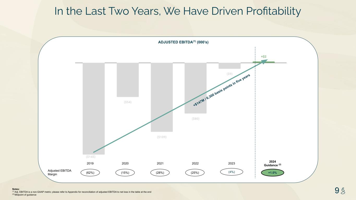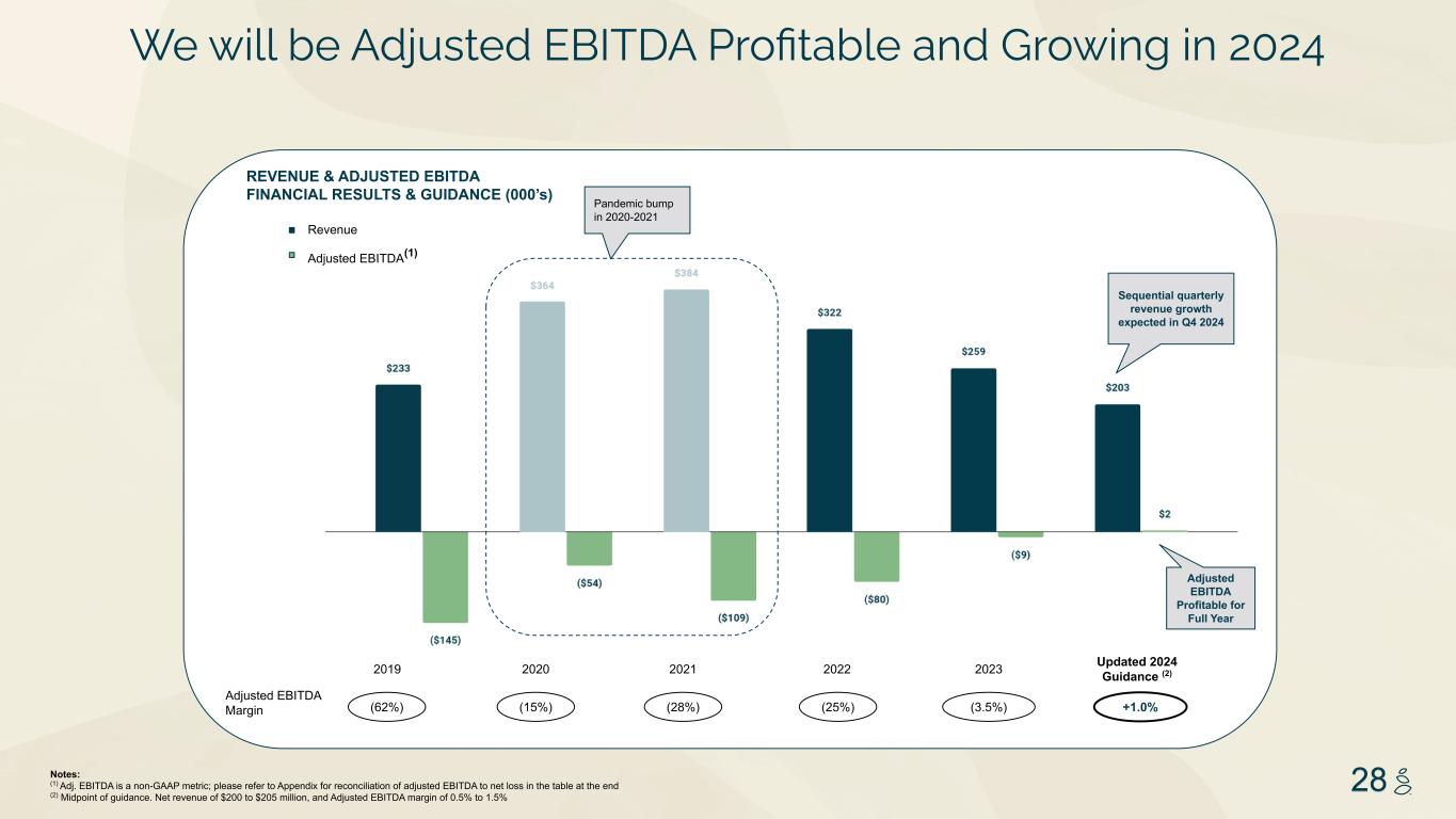 NOTES START FROM HERE AND GROW UP NO CONTENT BELOW THIS LINE CONTENT BELOW THIS LINE SUBTITLE BELOW THIS LINE TITLE CAN NOT GO ABOVE THIS LINE 3 59 76 0 114 88 120 159 144 130 186 128 102 163 157 172 196 200 255 255 255 0 0 0 247 243 228 3 59 76 247 243 228 28Notes: (1) Adj. EBITDA is a non-GAAP metric; please refer to Appendix for reconciliation of adjusted EBITDA to net loss in the table at the end (2) Midpoint of guidance. Net revenue of $200 to $205 million, and Adjusted EBITDA margin of 0.5% to 1.5% Revenue Adjusted EBITDA(1) Sequential quarterly revenue growth expected in Q4 2024 REVENUE & ADJUSTED EBITDA FINANCIAL RESULTS & GUIDANCE (000’s) Pandemic bump in 2020-2021 Adjusted EBITDA Profitable for Full Year 2019 2020 2022 (62%) Adjusted EBITDA Margin (15%) (28%) 2023 (3.5%) Updated 2024 Guidance (2) +1.0% 2021 (25%) We will be Adjusted EBITDA Profitable and Growing in 2024