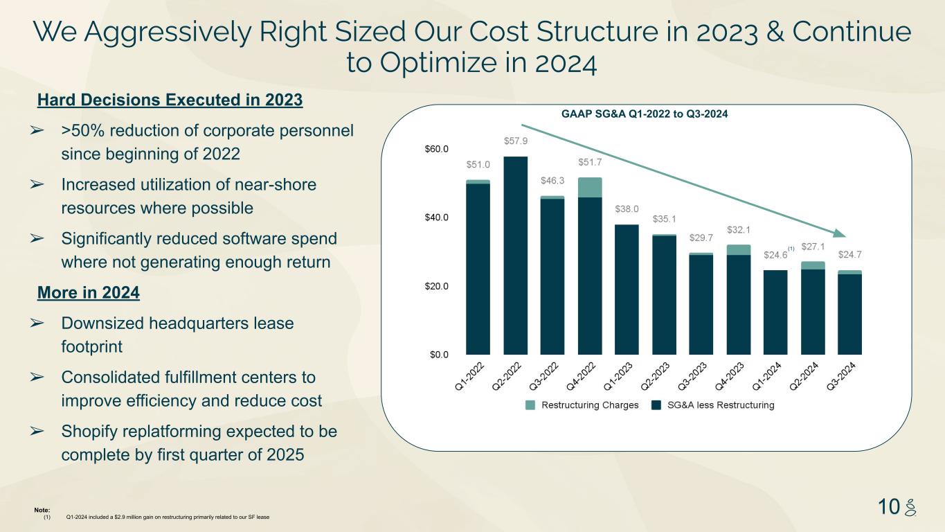 NOTES START FROM HERE AND GROW UP NO CONTENT BELOW THIS LINE CONTENT BELOW THIS LINE SUBTITLE BELOW THIS LINE TITLE CAN NOT GO ABOVE THIS LINE 3 59 76 0 114 88 120 159 144 130 186 128 102 163 157 172 196 200 255 255 255 0 0 0 247 243 228 3 59 76 247 243 228 10 Hard Decisions Executed in 2023 ➢ >50% reduction of corporate personnel since beginning of 2022 ➢ Increased utilization of near-shore resources where possible ➢ Significantly reduced software spend where not generating enough return More in 2024 ➢ Downsized headquarters lease footprint ➢ Consolidated fulfillment centers to improve efficiency and reduce cost ➢ Shopify replatforming expected to be complete by first quarter of 2025 Note: (1) Q1-2024 included a $2.9 million gain on restructuring primarily related to our SF lease GAAP SG&A Q1-2022 to Q3-2024 We Aggressively Right Sized Our Cost Structure in 2023 & Continue to Optimize in 2024 (1)