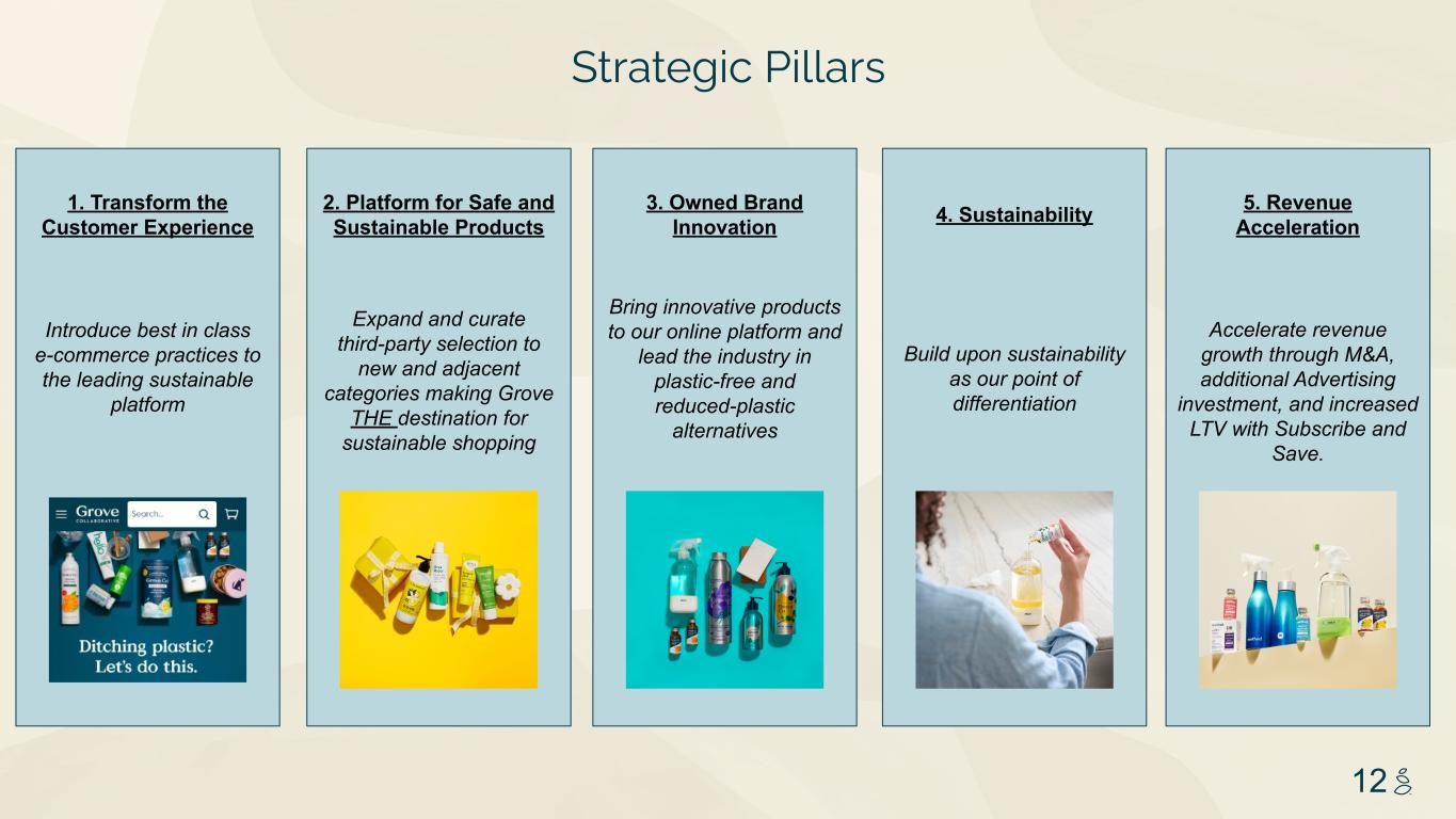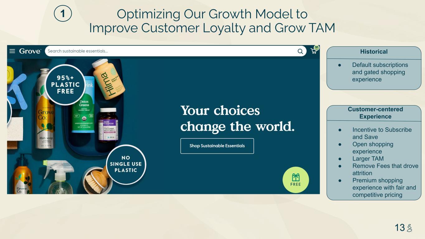 NOTES START FROM HERE AND GROW UP NO CONTENT BELOW THIS LINE CONTENT BELOW THIS LINE SUBTITLE BELOW THIS LINE TITLE CAN NOT GO ABOVE THIS LINE 3 59 76 0 114 88 120 159 144 130 186 128 102 163 157 172 196 200 255 255 255 0 0 0 247 243 228 3 59 76 247 243 228 12 Expand and curate third-party selection to new and adjacent categories making Grove THE destination for sustainable shopping Introduce best in class e-commerce practices to the leading sustainable platform Bring innovative products to our online platform and lead the industry in plastic-free and reduced-plastic alternatives Build upon sustainability as our point of differentiation 2. Platform for Safe and Sustainable Products 1. Transform the Customer Experience 3. Owned Brand Innovation 4. Sustainability 5. Revenue Acceleration Accelerate revenue growth through M&A, additional Advertising investment, and increased LTV with Subscribe and Save. Strategic Pillars