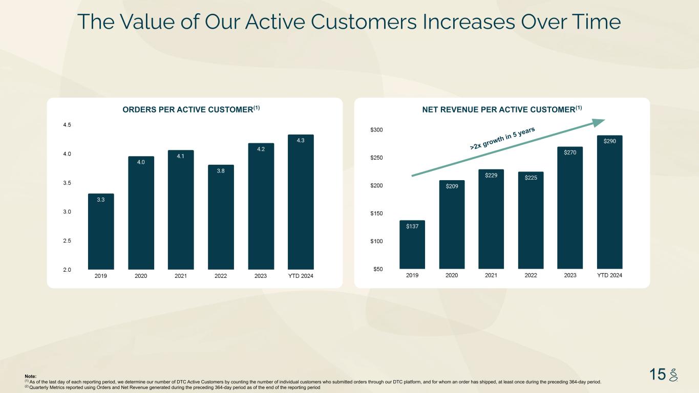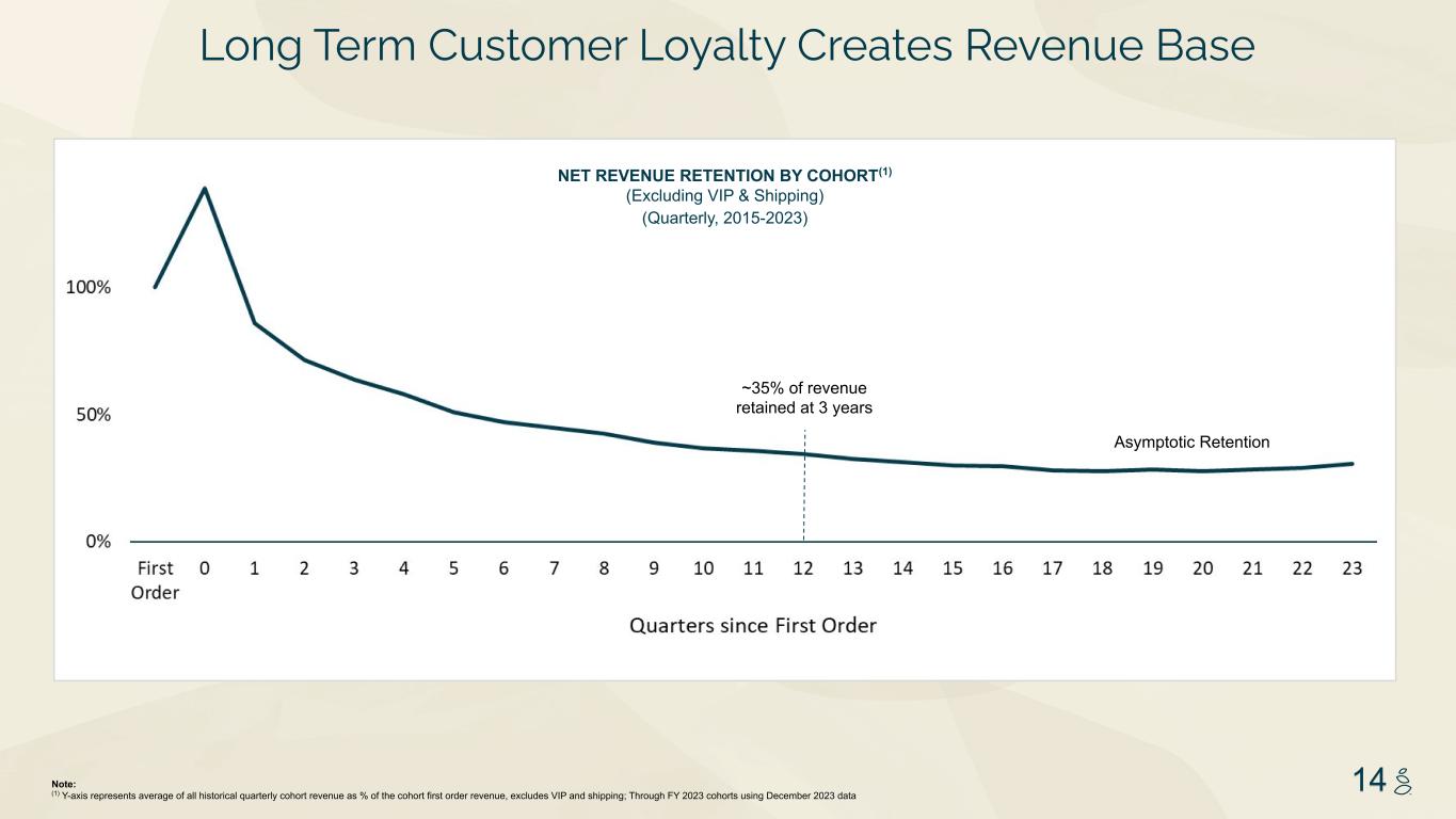 NOTES START FROM HERE AND GROW UP NO CONTENT BELOW THIS LINE CONTENT BELOW THIS LINE SUBTITLE BELOW THIS LINE TITLE CAN NOT GO ABOVE THIS LINE 3 59 76 0 114 88 120 159 144 130 186 128 102 163 157 172 196 200 255 255 255 0 0 0 247 243 228 3 59 76 247 243 228 14Note: (1) Y-axis represents average of all historical quarterly cohort revenue as % of the cohort first order revenue, excludes VIP and shipping; Through FY 2023 cohorts using December 2023 data NET REVENUE RETENTION BY COHORT(1) (Excluding VIP & Shipping) (Quarterly, 2015-2023) Asymptotic Retention Long Term Customer Loyalty Creates Revenue Base ~35% of revenue retained at 3 years