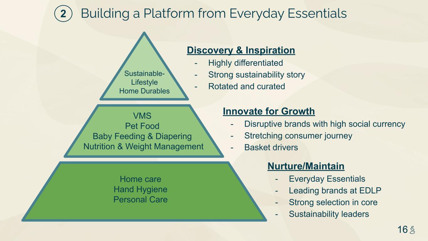 NOTES START FROM HERE AND GROW UP NO CONTENT BELOW THIS LINE CONTENT BELOW THIS LINE SUBTITLE BELOW THIS LINE TITLE CAN NOT GO ABOVE THIS LINE 3 59 76 0 114 88 120 159 144 130 186 128 102 163 157 172 196 200 255 255 255 0 0 0 247 243 228 3 59 76 247 243 228 16 Sustainable- Lifestyle Home Durables Home care Hand Hygiene Personal Care Nurture/Maintain - Everyday Essentials - Leading brands at EDLP - Strong selection in core - Sustainability leaders Innovate for Growth - Disruptive brands with high social currency - Stretching consumer journey - Basket drivers VMS Pet Food Baby Feeding & Diapering Nutrition & Weight Management Discovery & Inspiration - Highly differentiated - Strong sustainability story - Rotated and curated Building a Platform from Everyday Essentials2