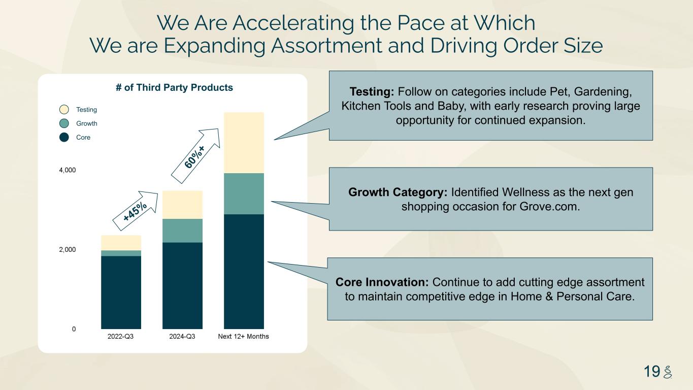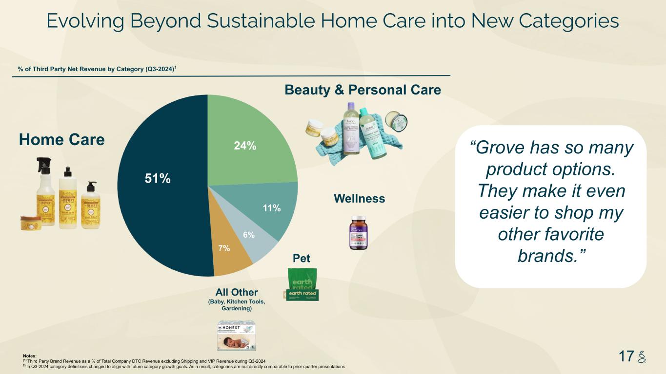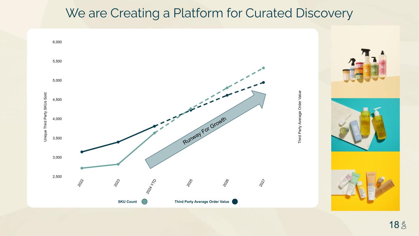 NOTES START FROM HERE AND GROW UP NO CONTENT BELOW THIS LINE CONTENT BELOW THIS LINE SUBTITLE BELOW THIS LINE TITLE CAN NOT GO ABOVE THIS LINE 3 59 76 0 114 88 120 159 144 130 186 128 102 163 157 172 196 200 255 255 255 0 0 0 247 243 228 3 59 76 247 243 228 17 Evolving Beyond Sustainable Home Care into New Categories 24% 11% 51% 6% 7% Notes: (1) Third Party Brand Revenue as a % of Total Company DTC Revenue excluding Shipping and VIP Revenue during Q3-2024 2) In Q3-2024 category definitions changed to align with future category growth goals. As a result, categories are not directly comparable to prior quarter presentations Home Care Beauty & Personal Care % of Third Party Net Revenue by Category (Q3-2024)1 “Grove has so many product options. They make it even easier to shop my other favorite brands.” Wellness Pet All Other (Baby, Kitchen Tools, Gardening)