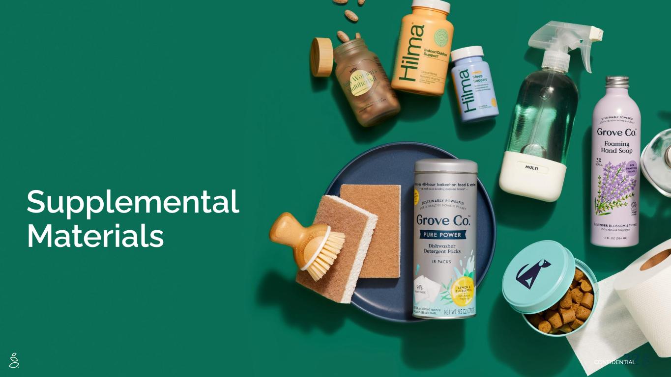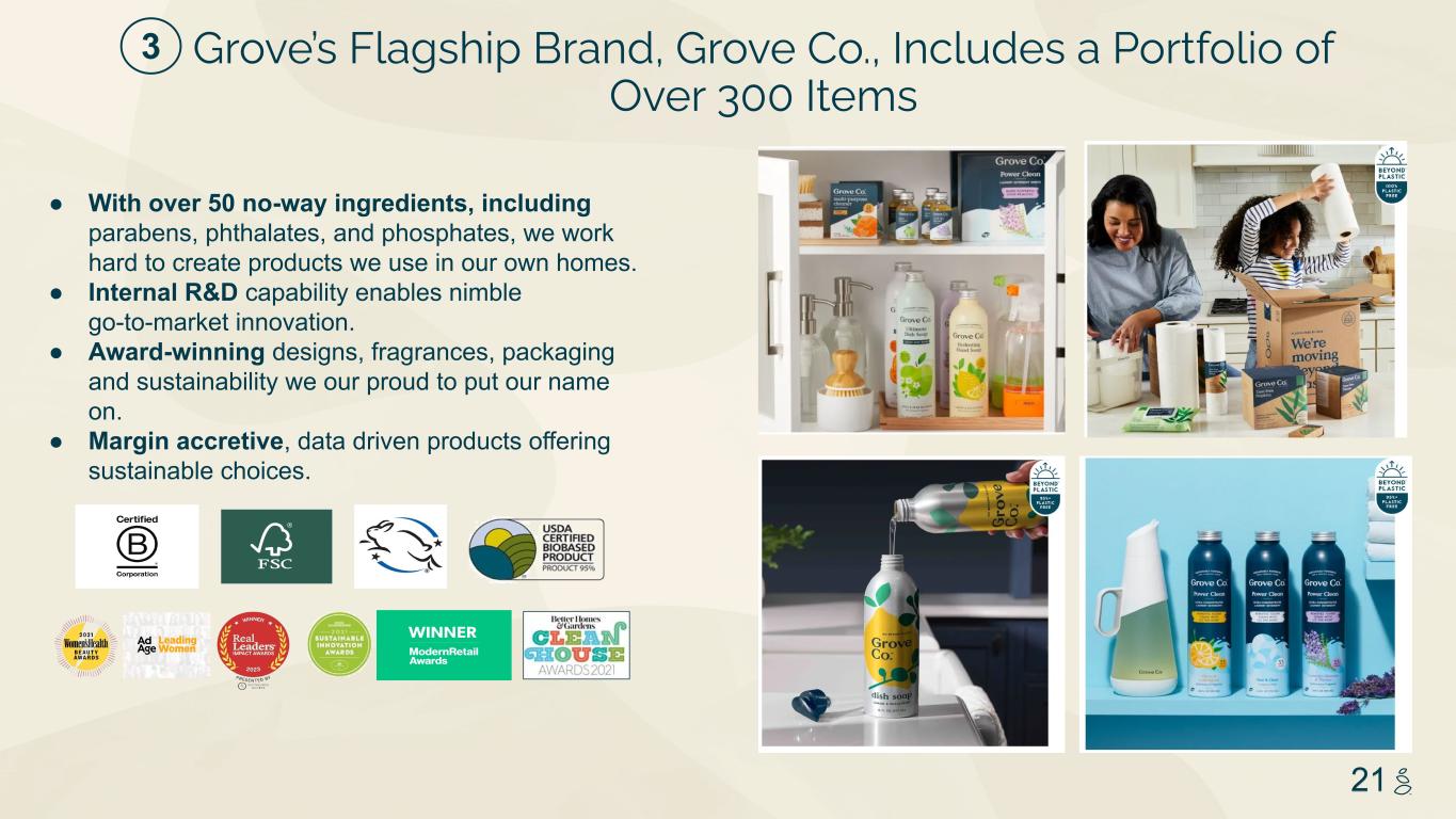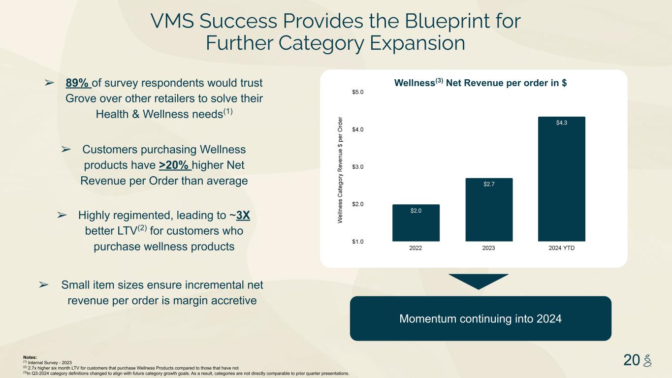 NOTES START FROM HERE AND GROW UP NO CONTENT BELOW THIS LINE CONTENT BELOW THIS LINE SUBTITLE BELOW THIS LINE TITLE CAN NOT GO ABOVE THIS LINE 3 59 76 0 114 88 120 159 144 130 186 128 102 163 157 172 196 200 255 255 255 0 0 0 247 243 228 3 59 76 247 243 228 20 Wellness(3) Net Revenue per order in $ ➢ Small item sizes ensure incremental net revenue per order is margin accretive ➢ Highly regimented, leading to ~3X better LTV(2) for customers who purchase wellness products ➢ Customers purchasing Wellness products have >20% higher Net Revenue per Order than average ➢ 89% of survey respondents would trust Grove over other retailers to solve their Health & Wellness needs(1) Momentum continuing into 2024 Notes: (1) Internal Survey - 2023 (2) 2.7x higher six month LTV for customers that purchase Wellness Products compared to those that have not (3)In Q3-2024 category definitions changed to align with future category growth goals. As a result, categories are not directly comparable to prior quarter presentations. VMS Success Provides the Blueprint for Further Category Expansion