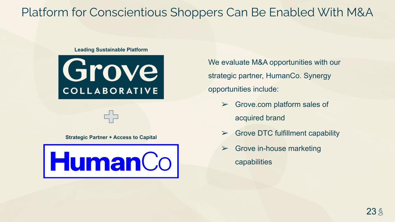 NOTES START FROM HERE AND GROW UP NO CONTENT BELOW THIS LINE CONTENT BELOW THIS LINE SUBTITLE BELOW THIS LINE TITLE CAN NOT GO ABOVE THIS LINE 3 59 76 0 114 88 120 159 144 130 186 128 102 163 157 172 196 200 255 255 255 0 0 0 247 243 228 3 59 76 247 243 228 23 Platform for Conscientious Shoppers Can Be Enabled With M&A We evaluate M&A opportunities with our strategic partner, HumanCo. Synergy opportunities include: ➢ Grove.com platform sales of acquired brand ➢ Grove DTC fulfillment capability ➢ Grove in-house marketing capabilities Leading Sustainable Platform Strategic Partner + Access to Capital