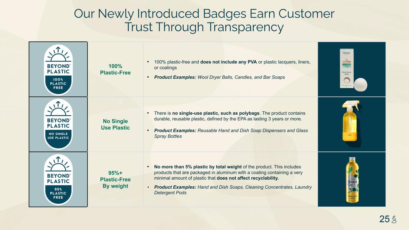 NOTES START FROM HERE AND GROW UP NO CONTENT BELOW THIS LINE CONTENT BELOW THIS LINE SUBTITLE BELOW THIS LINE TITLE CAN NOT GO ABOVE THIS LINE 3 59 76 0 114 88 120 159 144 130 186 128 102 163 157 172 196 200 255 255 255 0 0 0 247 243 228 3 59 76 247 243 228 25 Our Newly Introduced Badges Earn Customer Trust Through Transparency 100% Plastic-Free • 100% plastic-free and does not include any PVA or plastic lacquers, liners, or coatings • Product Examples: Wool Dryer Balls, Candles, and Bar Soaps No Single Use Plastic • There is no single-use plastic, such as polybags. The product contains durable, reusable plastic, defined by the EPA as lasting 3 years or more. • Product Examples: Reusable Hand and Dish Soap Dispensers and Glass Spray Bottles 95%+ Plastic-Free By weight • No more than 5% plastic by total weight of the product. This includes products that are packaged in aluminum with a coating containing a very minimal amount of plastic that does not affect recyclability. • Product Examples: Hand and Dish Soaps, Cleaning Concentrates, Laundry Detergent Pods