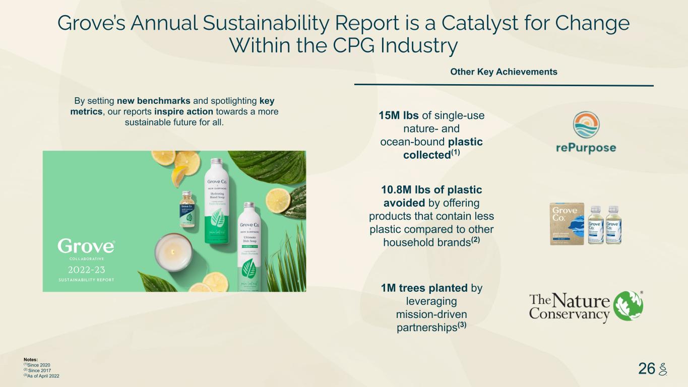 NOTES START FROM HERE AND GROW UP NO CONTENT BELOW THIS LINE CONTENT BELOW THIS LINE SUBTITLE BELOW THIS LINE TITLE CAN NOT GO ABOVE THIS LINE 3 59 76 0 114 88 120 159 144 130 186 128 102 163 157 172 196 200 255 255 255 0 0 0 247 243 228 3 59 76 247 243 228 26 Notes: (1)Since 2020 (2) Since 2017 (3)As of April 2022 15M lbs of single-use nature- and ocean-bound plastic collected(1) 10.8M lbs of plastic avoided by offering products that contain less plastic compared to other household brands(2) 1M trees planted by leveraging mission-driven partnerships(3) Other Key Achievements By setting new benchmarks and spotlighting key metrics, our reports inspire action towards a more sustainable future for all. Grove’s Annual Sustainability Report is a Catalyst for Change Within the CPG Industry