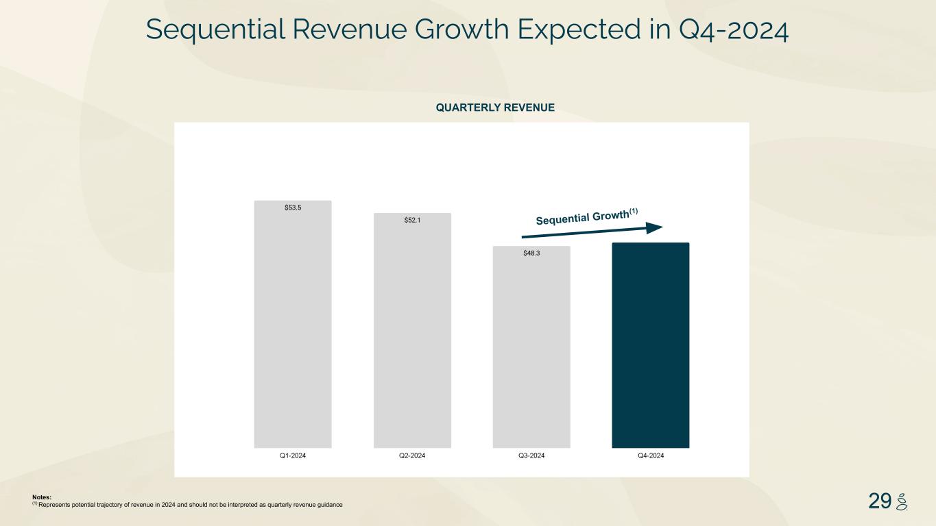 NOTES START FROM HERE AND GROW UP NO CONTENT BELOW THIS LINE CONTENT BELOW THIS LINE SUBTITLE BELOW THIS LINE TITLE CAN NOT GO ABOVE THIS LINE 3 59 76 0 114 88 120 159 144 130 186 128 102 163 157 172 196 200 255 255 255 0 0 0 247 243 228 3 59 76 247 243 228 29 Sequential Growth(1) Sequential Revenue Growth Expected in Q4-2024 QUARTERLY REVENUE Notes: (1) Represents potential trajectory of revenue in 2024 and should not be interpreted as quarterly revenue guidance