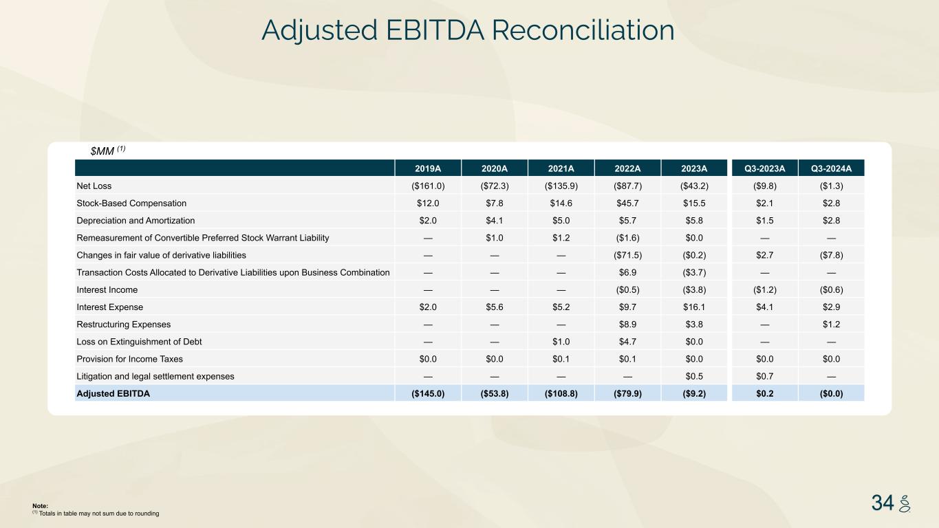 NOTES START FROM HERE AND GROW UP NO CONTENT BELOW THIS LINE CONTENT BELOW THIS LINE SUBTITLE BELOW THIS LINE TITLE CAN NOT GO ABOVE THIS LINE 3 59 76 0 114 88 120 159 144 130 186 128 102 163 157 172 196 200 255 255 255 0 0 0 247 243 228 3 59 76 247 243 228 34 Adjusted EBITDA Reconciliation $MM (1) Note: (1) Totals in table may not sum due to rounding 2019A 2020A 2021A 2022A 2023A Q3-2023A Q3-2024A Net Loss ($161.0) ($72.3) ($135.9) ($87.7) ($43.2) ($9.8) ($1.3) Stock-Based Compensation $12.0 $7.8 $14.6 $45.7 $15.5 $2.1 $2.8 Depreciation and Amortization $2.0 $4.1 $5.0 $5.7 $5.8 $1.5 $2.8 Remeasurement of Convertible Preferred Stock Warrant Liability — $1.0 $1.2 ($1.6) $0.0 — — Changes in fair value of derivative liabilities — — — ($71.5) ($0.2) $2.7 ($7.8) Transaction Costs Allocated to Derivative Liabilities upon Business Combination — — — $6.9 ($3.7) — — Interest Income — — — ($0.5) ($3.8) ($1.2) ($0.6) Interest Expense $2.0 $5.6 $5.2 $9.7 $16.1 $4.1 $2.9 Restructuring Expenses — — — $8.9 $3.8 — $1.2 Loss on Extinguishment of Debt — — $1.0 $4.7 $0.0 — — Provision for Income Taxes $0.0 $0.0 $0.1 $0.1 $0.0 $0.0 $0.0 Litigation and legal settlement expenses — — — — $0.5 $0.7 — Adjusted EBITDA ($145.0) ($53.8) ($108.8) ($79.9) ($9.2) $0.2 ($0.0)