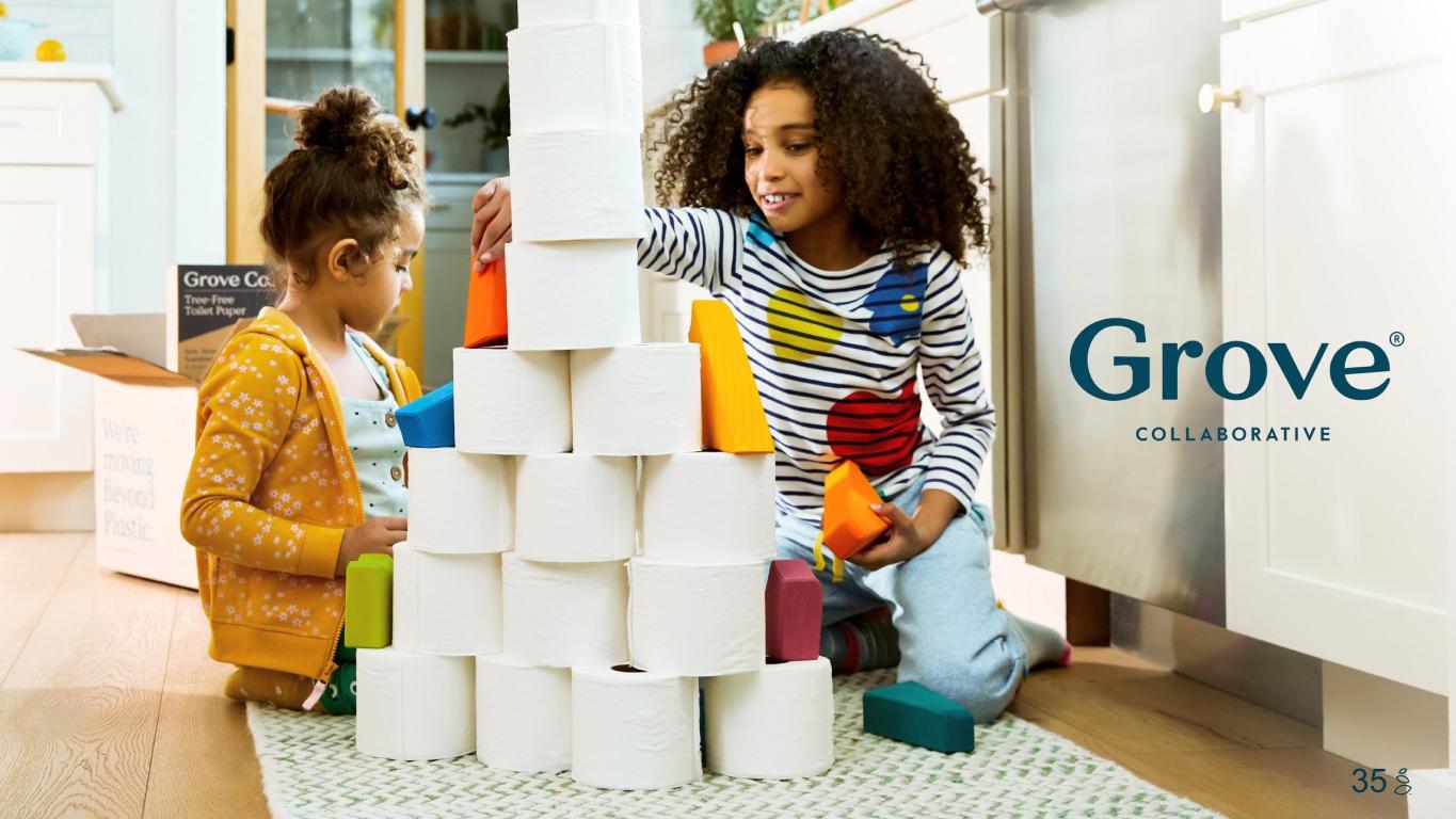 NOTES START FROM HERE AND GROW UP NO CONTENT BELOW THIS LINE CONTENT BELOW THIS LINE SUBTITLE BELOW THIS LINE TITLE CAN NOT GO ABOVE THIS LINE 3 59 76 0 114 88 120 159 144 130 186 128 102 163 157 172 196 200 255 255 255 0 0 0 247 243 228 3 59 76 247 243 228 33 Jeff Yurcisin, Chief Executive Officer ● Proven direct to consumer leadership as CEO of multiple billion-dollar brands, twice succeeding founders ● Experience overseeing owned brand creation, product development, and using tech to deliver a superior customer experience ● Passionate about the role the private sector can play in sustainability Sergio Cervantes, Chief Financial Officer ● Global Executive with entrepreneurial mindset and extensive leadership experience in turning around businesses & delivering sustainable profitable growth ● Integration of businesses post acquisition creating efficiencies across the P&L, BS and Cash Flow. ● Served as finance business partner to founders, CEOs, and heads of functional areas. while overlooking all support functions and operations. Chris Clark, Co-Founder & Chief Technology Officer ● Daily leadership of product management, engineering, analytics, data science, and digital product design functions in service of the company’s director-to-consumer business operations ● Established the company’s e-commerce platform and continuous evolution of the customer experience Scott Giesler, General Counsel ● Nearly 20 years of experience overseeing private and public ecommerce company legal functions ● Managed mergers, acquisitions, and other corporate reorganizations, initial public offerings, public and private company financing transactions and public company governance. Leadership Team With Depth of Ecommerce Experience to Execute Jennifer Pann, Vice President, Merchandising & E-Commerce ● 25+ years of expertise working across product categories for merchandising, inventory, and supply chain for e-commerce and brick and mortar retailers ● Leads all aspects of physical product buying and merchandising for Grove, including owned brand innovation and third party category, product expansion Jason Buursma, Vice President, Marketing ● Broad experience across marketing functions, including individual and cross-functional channels, to build brands and customer bases ● Manages day to day integrated marketing across acquisition, retention, brand, and public relations channels to articulate Grove’s value proposition and offering to new and existing customers ● Former professional athlete with passion for team-building