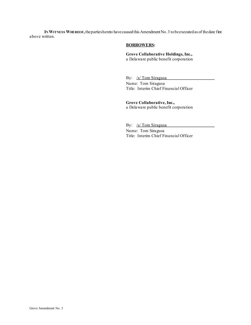 Grove Amendment No. 3 IN WITNESS WHEREOF, the parties hereto have caused this Amendment No. 3 to be executed as of the date first above written. LENDER: Siena Lending Group LLC By: /s/ Todd Eubanks Name: Daniel T. Eubanks Title: Authorized Signatory By: /s/ Michael Sessa Name: Michael Sessa Title: Authorized Signatory