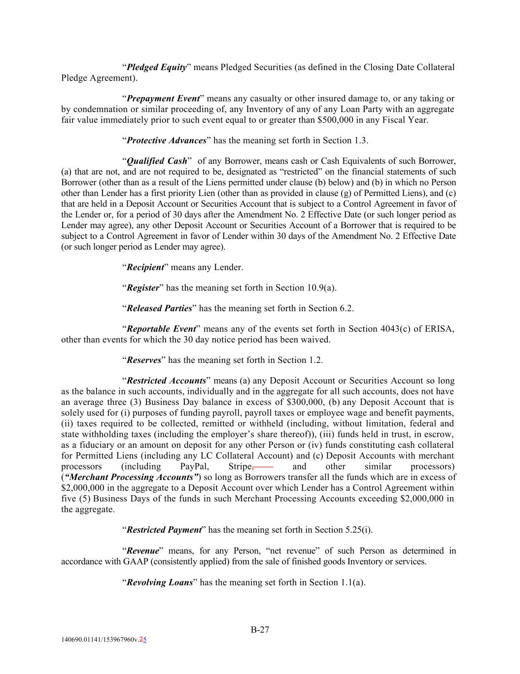 “Pledged Equity” means Pledged Securities (as defined in the Closing Date Collateral Pledge Agreement). “Prepayment Event” means any casualty or other insured damage to, or any taking or by condemnation or similar proceeding of, any Inventory of any of any Loan Party with an aggregate fair value immediately prior to such event equal to or greater than $500,000 in any Fiscal Year. “Protective Advances” has the meaning set forth in Section 1.3. “Qualified Cash” of any Borrower, means cash or Cash Equivalents of such Borrower, (a) that are not, and are not required to be, designated as “restricted” on the financial statements of such Borrower (other than as a result of the Liens permitted under clause (b) below) and (b) in which no Person other than Lender has a first priority Lien (other than as provided in clause (g) of Permitted Liens), and (c) that are held in a Deposit Account or Securities Account that is subject to a Control Agreement in favor of the Lender or, for a period of 30 days after the Amendment No. 2 Effective Date (or such longer period as Lender may agree), any other Deposit Account or Securities Account of a Borrower that is required to be subject to a Control Agreement in favor of Lender within 30 days of the Amendment No. 2 Effective Date (or such longer period as Lender may agree). “Recipient” means any Lender. “Register” has the meaning set forth in Section 10.9(a). “Released Parties” has the meaning set forth in Section 6.2. “Reportable Event” means any of the events set forth in Section 4043(c) of ERISA, other than events for which the 30 day notice period has been waived. “Reserves” has the meaning set forth in Section 1.2. “Restricted Accounts” means (a) any Deposit Account or Securities Account so long as the balance in such accounts, individually and in the aggregate for all such accounts, does not have an average three (3) Business Day balance in excess of $300,000, (b) any Deposit Account that is solely used for (i) purposes of funding payroll, payroll taxes or employee wage and benefit payments, (ii) taxes required to be collected, remitted or withheld (including, without limitation, federal and state withholding taxes (including the employer’s share thereof)), (iii) funds held in trust, in escrow, as a fiduciary or an amount on deposit for any other Person or (iv) funds constituting cash collateral for Permitted Liens (including any LC Collateral Account) and (c) Deposit Accounts with merchant processors (including PayPal, Stripe, and other similar processors) (“Merchant Processing Accounts”) so long as Borrowers transfer all the funds which are in excess of $2,000,000 in the aggregate to a Deposit Account over which Lender has a Control Agreement within five (5) Business Days of the funds in such Merchant Processing Accounts exceeding $2,000,000 in the aggregate. “Restricted Payment” has the meaning set forth in Section 5.25(i). “Revenue” means, for any Person, “net revenue” of such Person as determined in accordance with GAAP (consistently applied) from the sale of finished goods Inventory or services. “Revolving Loans” has the meaning set forth in Section 1.1(a). B-27 140690.01141/153967960v.25