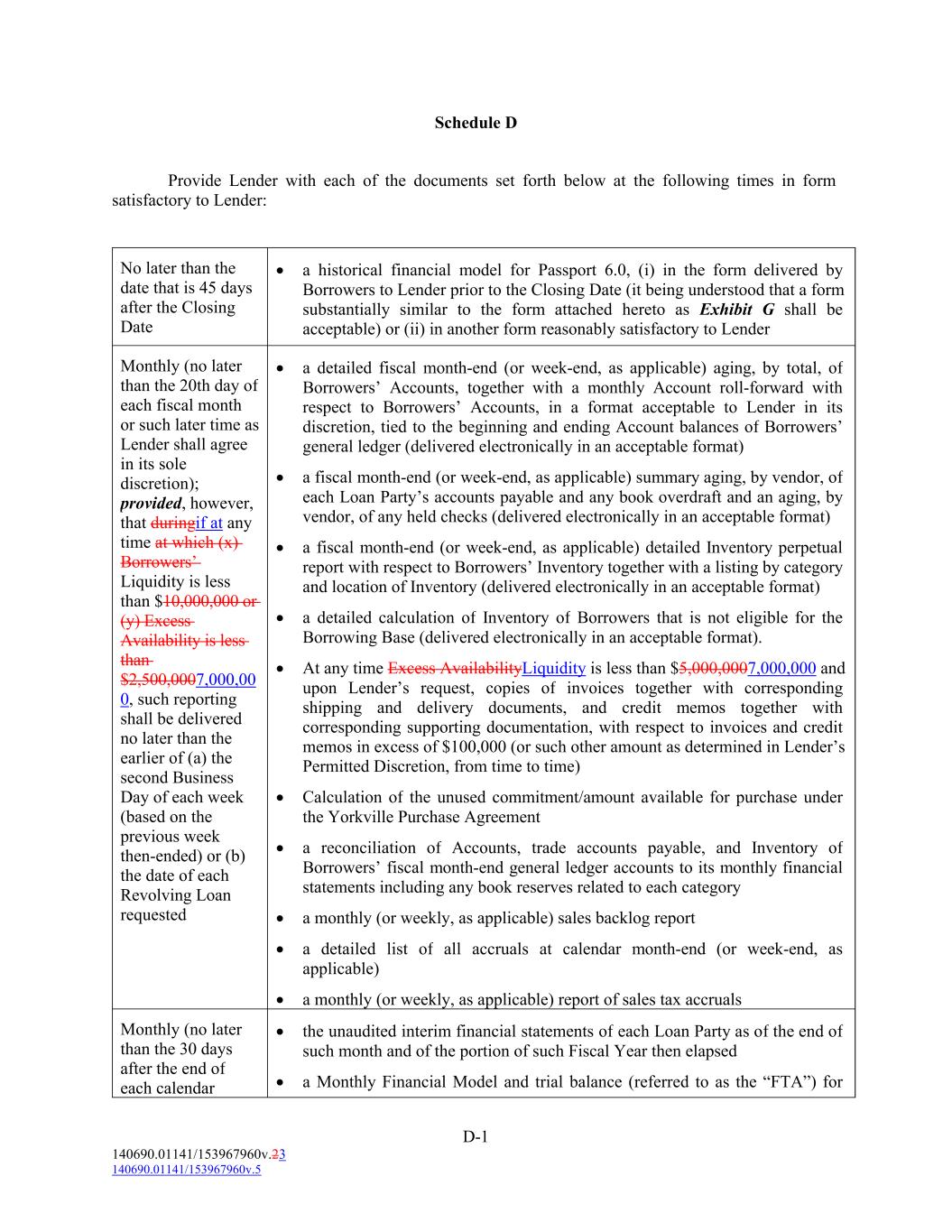 D-1 140690.01141/153967960v.23 140690.01141/153967960v.5 Monthly (no later than the 20th day of each fiscal month or such later time as Lender shall agree in its sole discretion); provided, however, that duringif at any time at which (x) Borrowers’ Liquidity is less than $10,000,000 or (y) Excess Availability is less than $2,500,0007,000,00 0, such reporting shall be delivered no later than the earlier of (a) the second Business Day of each week (based on the previous week then-ended) or (b) the date of each Revolving Loan requested a detailed fiscal month-end (or week-end, as applicable) aging, by total, of Borrowers’ Accounts, together with a monthly Account roll-forward with respect to Borrowers’ Accounts, in a format acceptable to Lender in its discretion, tied to the beginning and ending Account balances of Borrowers’ general ledger (delivered electronically in an acceptable format) a fiscal month-end (or week-end, as applicable) summary aging, by vendor, of each Loan Party’s accounts payable and any book overdraft and an aging, by vendor, of any held checks (delivered electronically in an acceptable format) a fiscal month-end (or week-end, as applicable) detailed Inventory perpetual report with respect to Borrowers’ Inventory together with a listing by category and location of Inventory (delivered electronically in an acceptable format) a detailed calculation of Inventory of Borrowers that is not eligible for the Borrowing Base (delivered electronically in an acceptable format). At any time Excess AvailabilityLiquidity is less than $5,000,0007,000,000 and upon Lender’s request, copies of invoices together with corresponding shipping and delivery documents, and credit memos together with corresponding supporting documentation, with respect to invoices and credit memos in excess of $100,000 (or such other amount as determined in Lender’s Permitted Discretion, from time to time) Calculation of the unused commitment/amount available for purchase under the Yorkville Purchase Agreement a reconciliation of Accounts, trade accounts payable, and Inventory of Borrowers’ fiscal month-end general ledger accounts to its monthly financial statements including any book reserves related to each category a monthly (or weekly, as applicable) sales backlog report a detailed list of all accruals at calendar month-end (or week-end, as applicable) a monthly (or weekly, as applicable) report of sales tax accruals No later than the date that is 45 days after the Closing Date Monthly (no later than the 30 days after the end of each calendar a historical financial model for Passport 6.0, (i) in the form delivered by Borrowers to Lender prior to the Closing Date (it being understood that a form substantially similar to the form attached hereto as Exhibit G shall be acceptable) or (ii) in another form reasonably satisfactory to Lender the unaudited interim financial statements of each Loan Party as of the end of such month and of the portion of such Fiscal Year then elapsed a Monthly Financial Model and trial balance (referred to as the “FTA”) for Schedule D Provide Lender with each of the documents set forth below at the following times in form satisfactory to Lender: