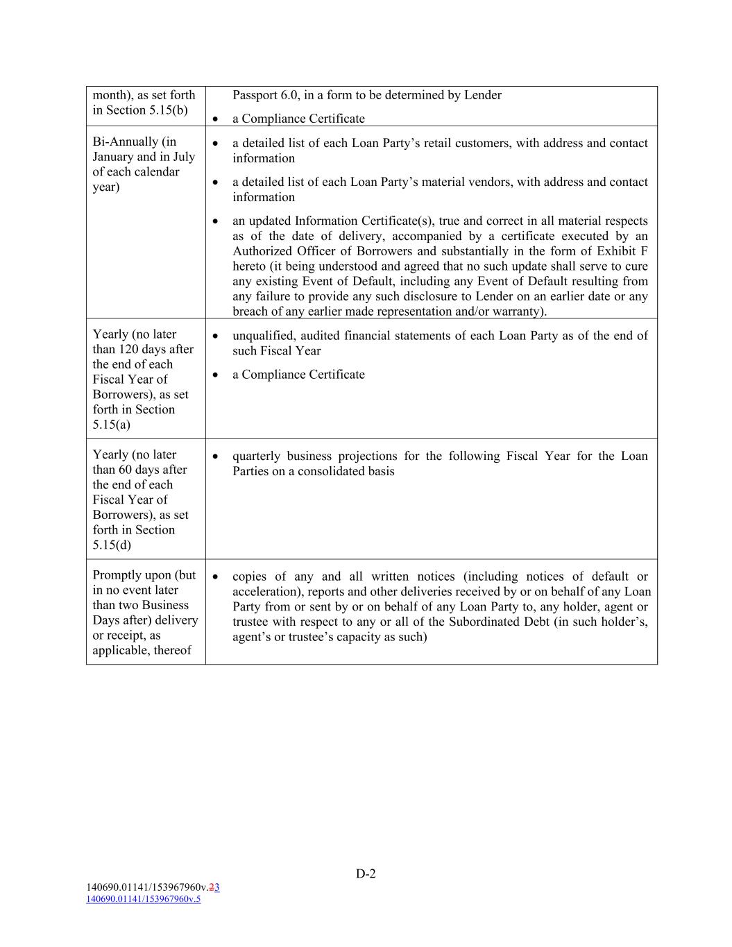 D-2 140690.01141/153967960v.23 140690.01141/153967960v.5 Yearly (no later than 120 days after the end of each Fiscal Year of Borrowers), as set forth in Section 5.15(a) unqualified, audited financial statements of each Loan Party as of the end of such Fiscal Year a Compliance Certificate Yearly (no later than 60 days after the end of each Fiscal Year of Borrowers), as set forth in Section 5.15(d) Bi-Annually (in January and in July of each calendar year) quarterly business projections for the following Fiscal Year for the Loan Parties on a consolidated basis month), as set forth in Section 5.15(b) a detailed list of each Loan Party’s retail customers, with address and contact information a detailed list of each Loan Party’s material vendors, with address and contact information an updated Information Certificate(s), true and correct in all material respects as of the date of delivery, accompanied by a certificate executed by an Authorized Officer of Borrowers and substantially in the form of Exhibit F hereto (it being understood and agreed that no such update shall serve to cure any existing Event of Default, including any Event of Default resulting from any failure to provide any such disclosure to Lender on an earlier date or any breach of any earlier made representation and/or warranty). Promptly upon (but in no event later than two Business Days after) delivery or receipt, as applicable, thereof copies of any and all written notices (including notices of default or acceleration), reports and other deliveries received by or on behalf of any Loan Party from or sent by or on behalf of any Loan Party to, any holder, agent or trustee with respect to any or all of the Subordinated Debt (in such holder’s, agent’s or trustee’s capacity as such) Passport 6.0, in a form to be determined by Lender a Compliance Certificate