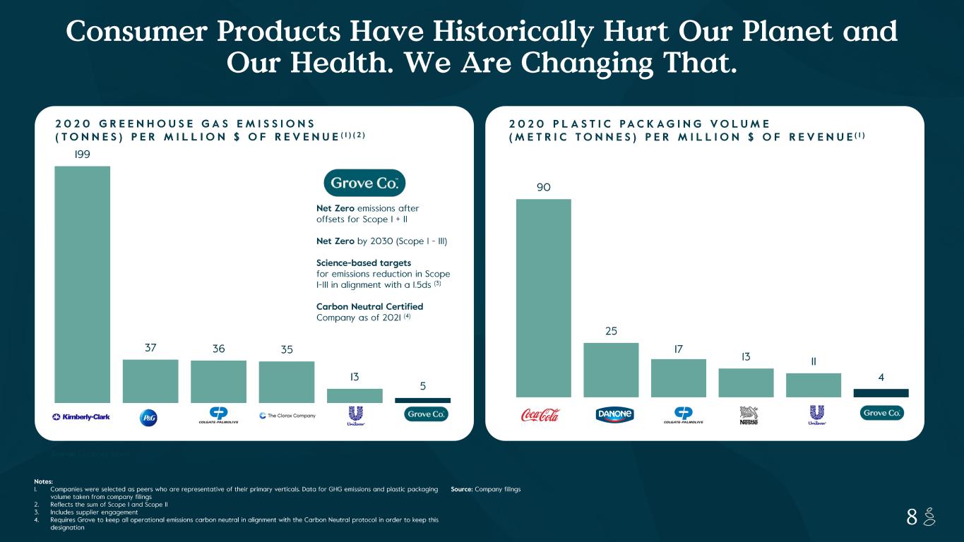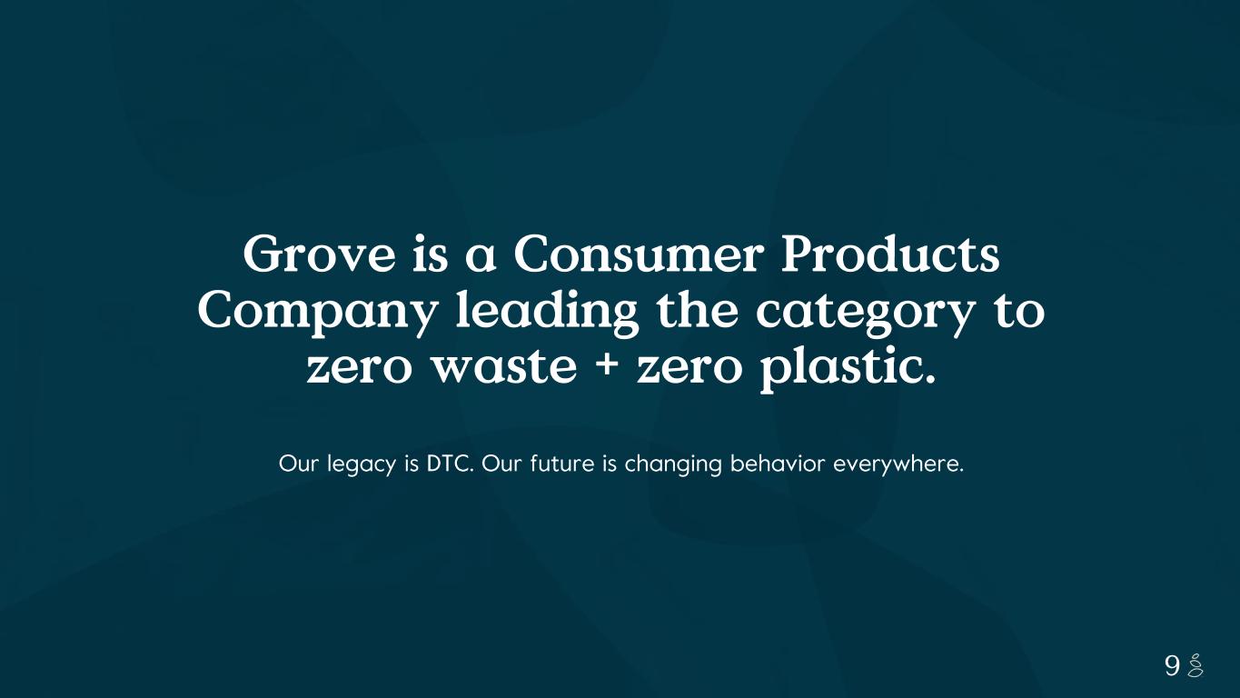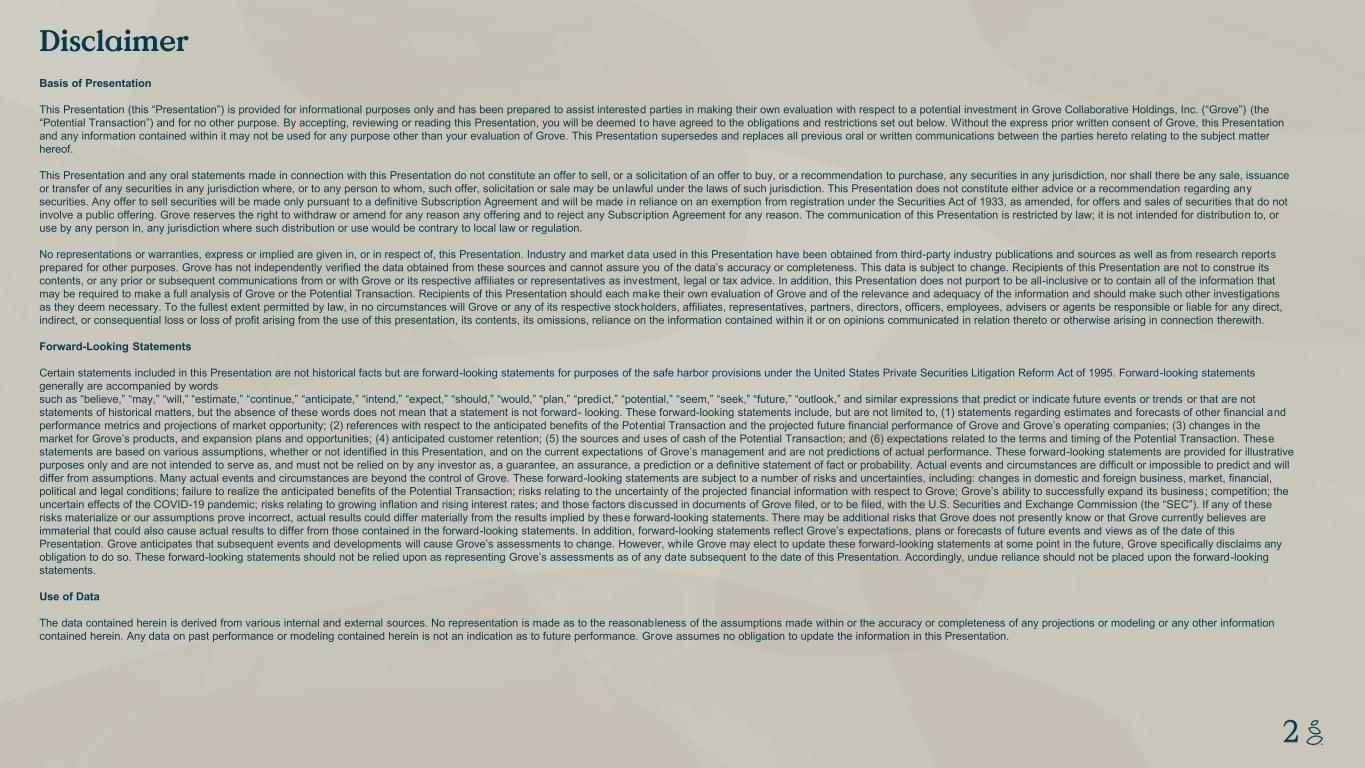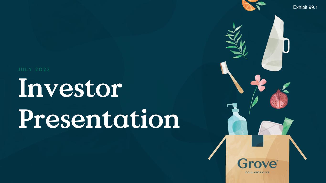 NOTES START FROM HERE AND GROW UP CONTENT BELOW THIS LINE CONTENT BELOW THIS LINE SUBTITLE BELOW THIS LINE TITLE CAN NOT GO ABOVE THIS LINE Basis of Presentation This Presentation (this “Presentation”) is provided for informational purposes only and has been prepared to assist interested parties in making their own evaluation with respect to a potential investment in Grove Collaborative Holdings, Inc. (“Grove”) (the “Potential Transaction”) and for no other purpose. By accepting, reviewing or reading this Presentation, you will be deemed to have agreed to the obligations and restrictions set out below. Without the express prior written consent of Grove, this Presentation and any information contained within it may not be used for any purpose other than your evaluation of Grove. This Presentation supersedes and replaces all previous oral or written communications between the parties hereto relating to the subject matter hereof. This Presentation and any oral statements made in connection with this Presentation do not constitute an offer to sell, or a solicitation of an offer to buy, or a recommendation to purchase, any securities in any jurisdiction, nor shall there be any sale, issuance or transfer of any securities in any jurisdiction where, or to any person to whom, such offer, solicitation or sale may be unlawful under the laws of such jurisdiction. This Presentation does not constitute either advice or a recommendation regarding any securities. Any offer to sell securities will be made only pursuant to a definitive Subscription Agreement and will be made in reliance on an exemption from registration under the Securities Act of 1933, as amended, for offers and sales of securities that do not involve a public offering. Grove reserves the right to withdraw or amend for any reason any offering and to reject any Subscription Agreement for any reason. The communication of this Presentation is restricted by law; it is not intended for distribution to, or use by any person in, any jurisdiction where such distribution or use would be contrary to local law or regulation. No representations or warranties, express or implied are given in, or in respect of, this Presentation. Industry and market data used in this Presentation have been obtained from third-party industry publications and sources as well as from research reports prepared for other purposes. Grove has not independently verified the data obtained from these sources and cannot assure you of the data’s accuracy or completeness. This data is subject to change. Recipients of this Presentation are not to construe its contents, or any prior or subsequent communications from or with Grove or its respective affiliates or representatives as investment, legal or tax advice. In addition, this Presentation does not purport to be all-inclusive or to contain all of the information that may be required to make a full analysis of Grove or the Potential Transaction. Recipients of this Presentation should each make their own evaluation of Grove and of the relevance and adequacy of the information and should make such other investigations as they deem necessary. To the fullest extent permitted by law, in no circumstances will Grove or any of its respective stockholders, affiliates, representatives, partners, directors, officers, employees, advisers or agents be responsible or liable for any direct, indirect, or consequential loss or loss of profit arising from the use of this presentation, its contents, its omissions, reliance on the information contained within it or on opinions communicated in relation thereto or otherwise arising in connection therewith. Forward-Looking Statements Certain statements included in this Presentation are not historical facts but are forward-looking statements for purposes of the safe harbor provisions under the United States Private Securities Litigation Reform Act of 1995. Forward-looking statements generally are accompanied by words such as “believe,” “may,” “will,” “estimate,” “continue,” “anticipate,” “intend,” “expect,” “should,” “would,” “plan,” “predict,” “potential,” “seem,” “seek,” “future,” “outlook,” and similar expressions that predict or indicate future events or trends or that are not statements of historical matters, but the absence of these words does not mean that a statement is not forward- looking. These forward-looking statements include, but are not limited to, (1) statements regarding estimates and forecasts of other financial and performance metrics and projections of market opportunity; (2) references with respect to the anticipated benefits of the Potential Transaction and the projected future financial performance of Grove and Grove’s operating companies; (3) changes in the market for Grove’s products, and expansion plans and opportunities; (4) anticipated customer retention; (5) the sources and uses of cash of the Potential Transaction; and (6) expectations related to the terms and timing of the Potential Transaction. These statements are based on various assumptions, whether or not identified in this Presentation, and on the current expectations of Grove’s management and are not predictions of actual performance. These forward-looking statements are provided for illustrative purposes only and are not intended to serve as, and must not be relied on by any investor as, a guarantee, an assurance, a prediction or a definitive statement of fact or probability. Actual events and circumstances are difficult or impossible to predict and will differ from assumptions. Many actual events and circumstances are beyond the control of Grove. These forward-looking statements are subject to a number of risks and uncertainties, including: changes in domestic and foreign business, market, financial, political and legal conditions; failure to realize the anticipated benefits of the Potential Transaction; risks relating to the 
