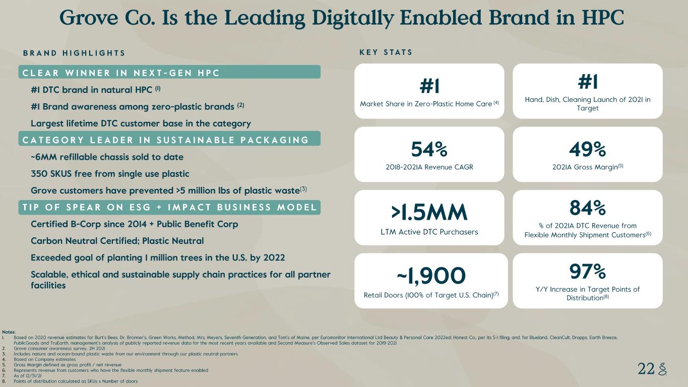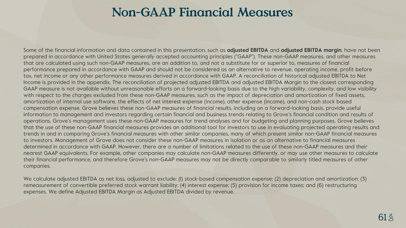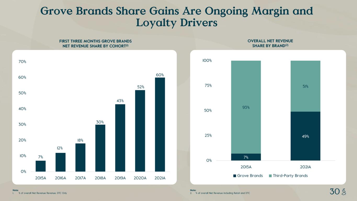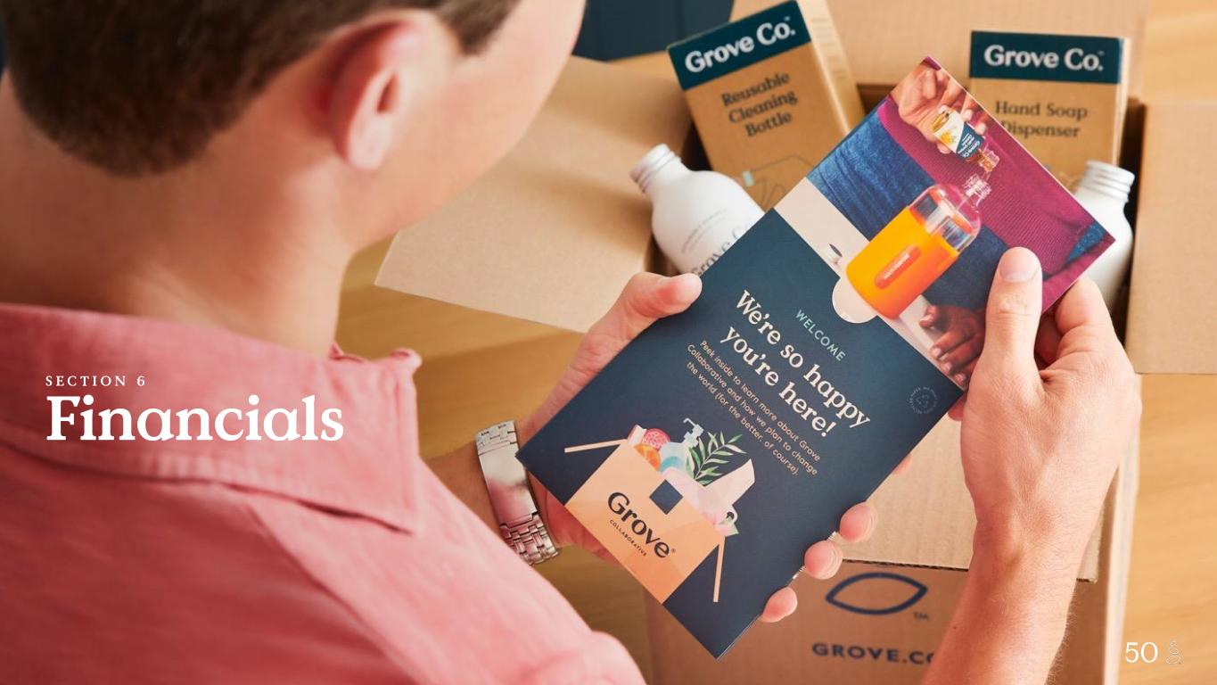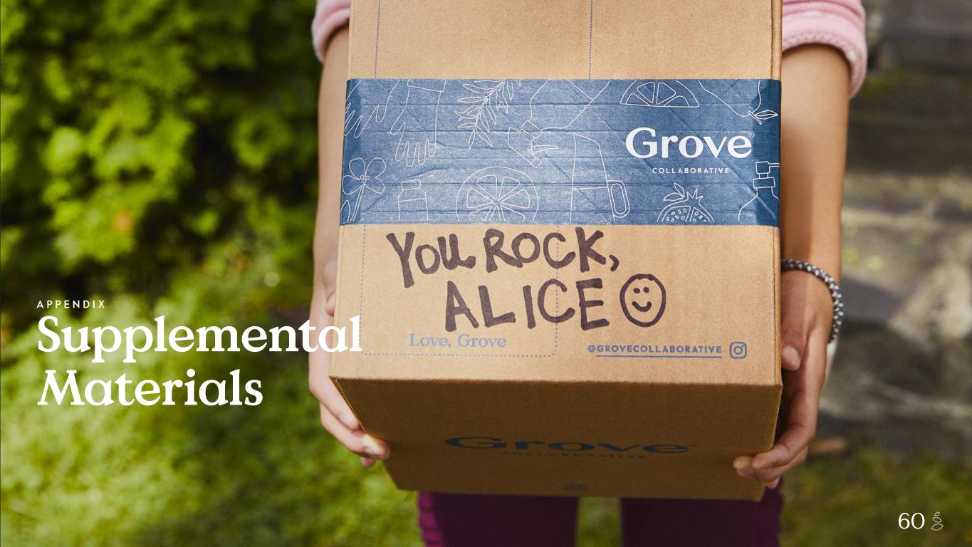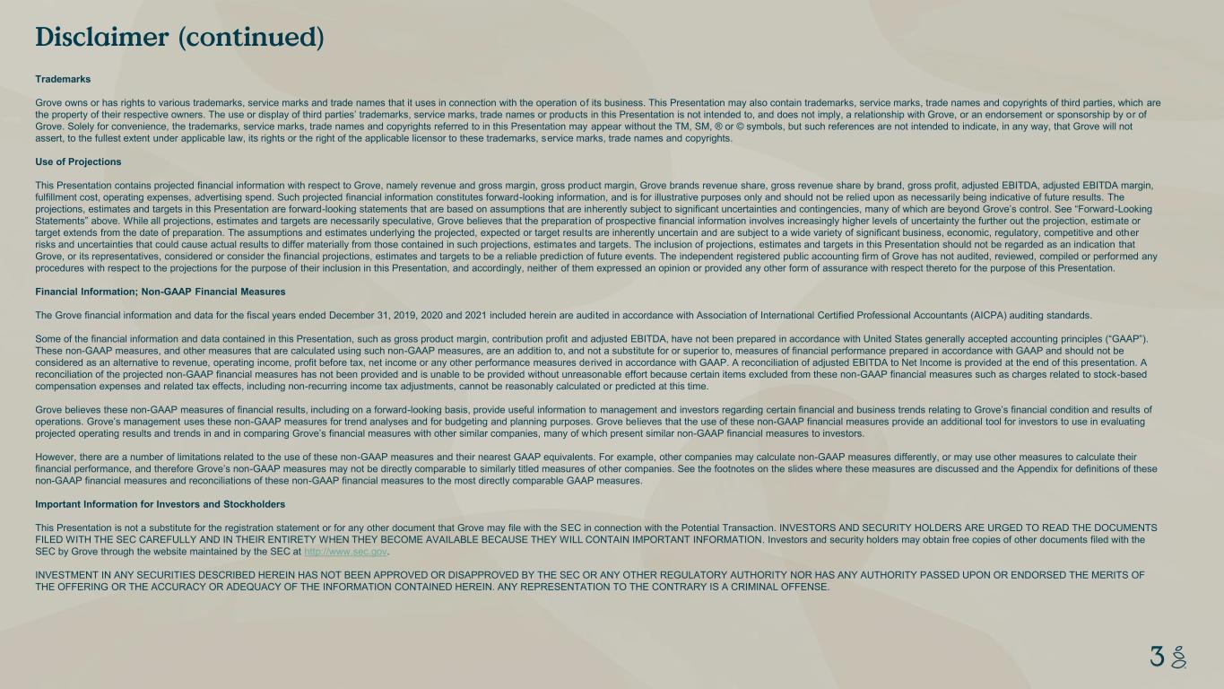 NOTES START FROM HERE AND GROW UP CONTENT BELOW THIS LINE CONTENT BELOW THIS LINE SUBTITLE BELOW THIS LINE TITLE CAN NOT GO ABOVE THIS LINE Trademarks Grove owns or has rights to various trademarks, service marks and trade names that it uses in connection with the operation of its business. This Presentation may also contain trademarks, service marks, trade names and copyrights of third parties, which are the property of their respective owners. The use or display of third parties’ trademarks, service marks, trade names or products in this Presentation is not intended to, and does not imply, a relationship with Grove, or an endorsement or sponsorship by or of Grove. Solely for convenience, the trademarks, service marks, trade names and copyrights referred to in this Presentation may appear without the TM, SM, ® or © symbols, but such references are not intended to indicate, in any way, that Grove will not assert, to the fullest extent under applicable law, its rights or the right of the applicable licensor to these trademarks, service marks, trade names and copyrights. Use of Projections This Presentation contains projected financial information with respect to Grove, namely revenue and gross margin, gross product margin, Grove brands revenue share, gross revenue share by brand, gross profit, adjusted EBITDA, adjusted EBITDA margin, fulfillment cost, operating expenses, advertising spend. Such projected financial information constitutes forward-looking information, and is for illustrative purposes only and should not be relied upon as necessarily being indicative of future results. The projections, estimates and targets in this Presentation are forward-looking statements that are based on assumptions that are inherently subject to significant uncertainties and contingencies, many of which are beyond Grove’s control. See “Forward-Looking Statements” above. While all projections, estimates and targets are necessarily speculative, Grove believes that the preparat ion of prospective financial information involves increasingly higher levels of uncertainty the further out the projection, estimate or target extends from the date of preparation. The assumptions and estimates underlying the projected, expected or target results are inherently uncertain and are subject to a wide variety of significant business, economic, regulatory, competitive and other risks and uncertainties that could cause actual results to differ materially from those contained in such projections, estimates and targets. The inclusion of projections, estimates and targets in this Presentation should not be regarded as an indication that Grove, or its representatives, considered or consider the financial projections, estimates and targets to be a reliable prediction of future events. The independent registered public accounting firm of Grove has not audited, reviewed, compiled or performed any procedures with respect to the projections for the purpose of their inclusion in this Presentation, and accordingly, neither of them expressed an opinion or provided any other form of assurance with respect thereto for the purpose of this Presentation. Financial Information; Non-GAAP Financial Measures The Grove financial information and data for the fiscal years ended December 31, 2019, 2020 and 2021 included herein are audited in accordance with Association of International Certified Professional Accountants (AICPA) auditing standards. Some of the financial information and data contained in this Presentation, such as gross product margin, contribution profit and adjusted EBITDA, have not been prepared in accordance with United States generally accepted accounting principles (“GAAP”). These non-GAAP measures, and other measures that are calculated using such non-GAAP measures, are an addition to, and not a substitute for or superior to, measures of financial performance prepared in accordance with GAAP and should not be considered as an alternative to revenue, operating income, profit before tax, net income or any other performance measures derived in accordance with GAAP. A reconciliation of adjusted EBITDA to Net Income is provided at the end of this presentation. A reconciliation of the projected non-GAAP financial measures has not been provided and is unable to be provided without unreasonable effort because certain items excluded from these non-GAAP financial measures such as charges related to stock-based compensation expenses and related tax effects, including non-recurring income tax adjustments, cannot be reasonably calculated or predicted at this time. Grove believes these non-GAAP measures of financial results, including on a forward-looking basis, provide useful information to management and investors regarding certain financial and business trends relating to Grove’s financial condition and results of operations. Grove’s management uses these non-GAAP measures for trend analyses and for budgeting and planning purposes. Grove believes that the use of these non-GAAP financial measures provide an additional tool for investors to use in evaluating projected operating results and trends in and in comparing Grove’s financial measures with other similar companies, many of which present similar non-GAAP financial measures to investors. However, there are a number of limitations related to the use of these non-GAAP measures and their nearest GAAP equivalents. For example, other companies may calculate non-GAAP measures differently, or may use other measures to calculate their financial performance, and therefore Grove’s non-GAAP measures may not be directly comparable to similarly titled measures of other companies. See the footnotes on the slides where these measures are discussed and the Appendix for definitions of these non-GAAP financial measures and reconciliations of these non-GAAP financial measures to the most directly comparable GAAP measures. Important Information for Investors and Stockholders This 