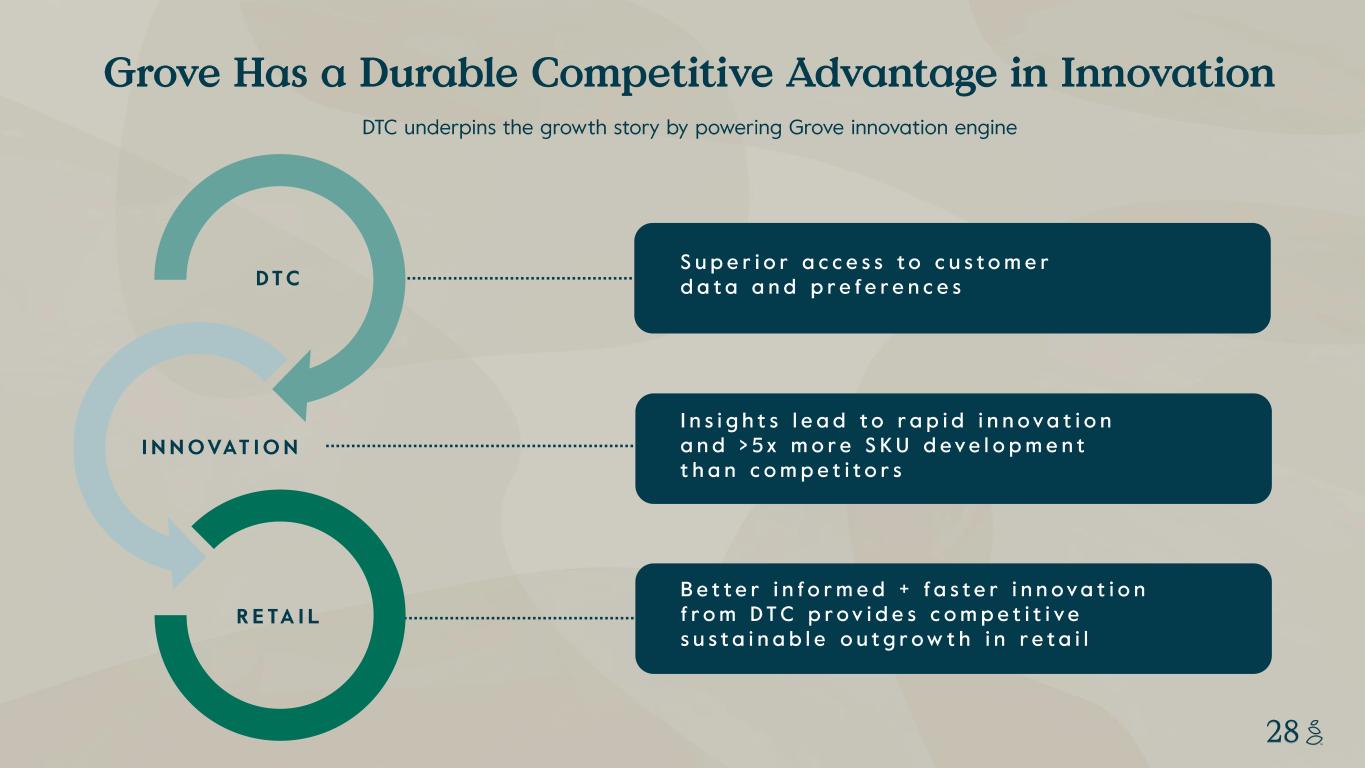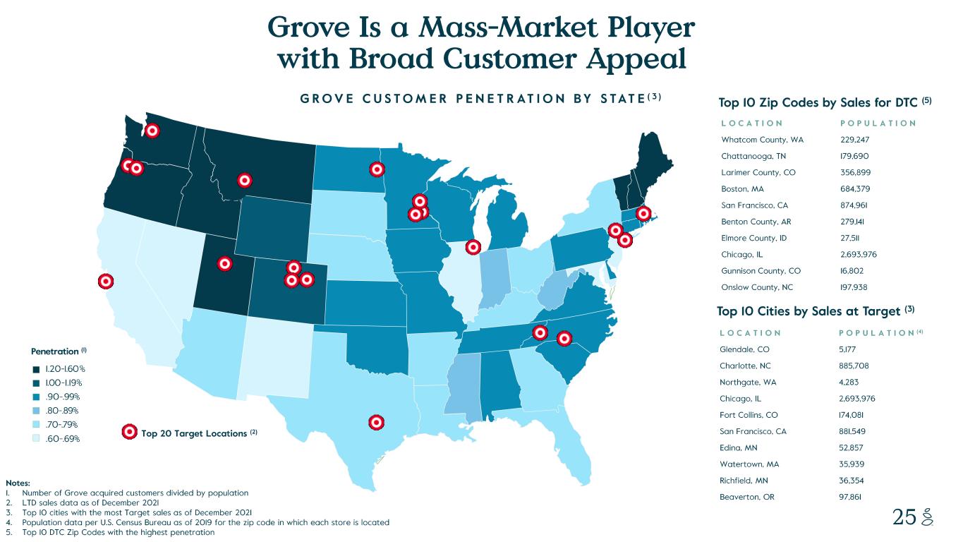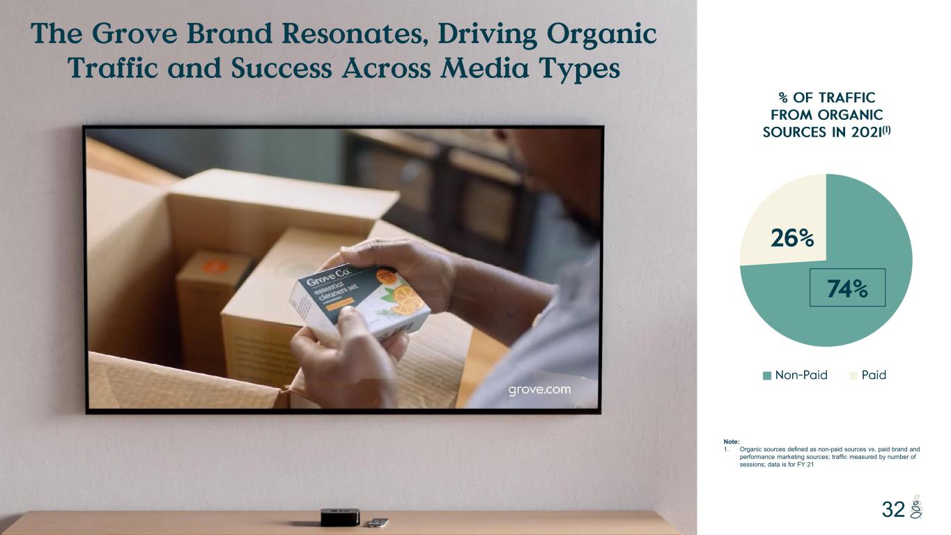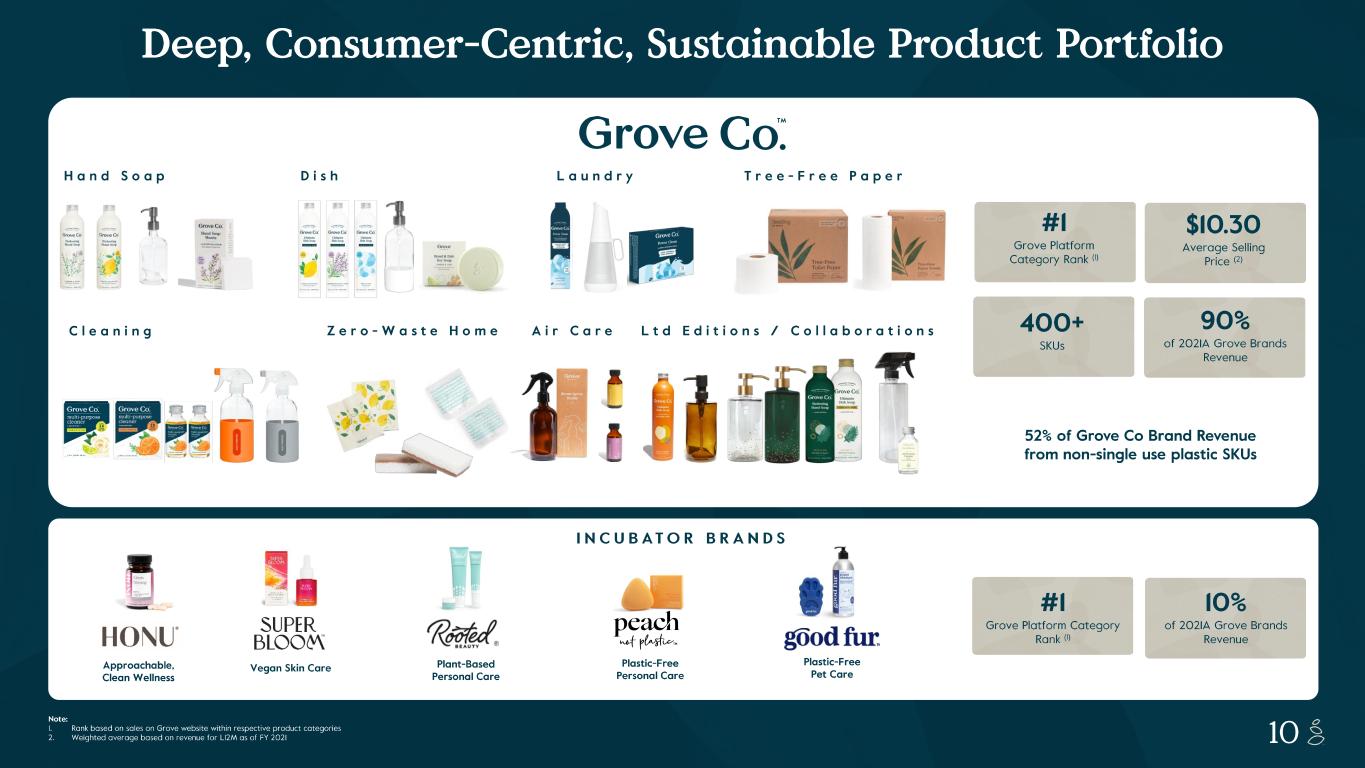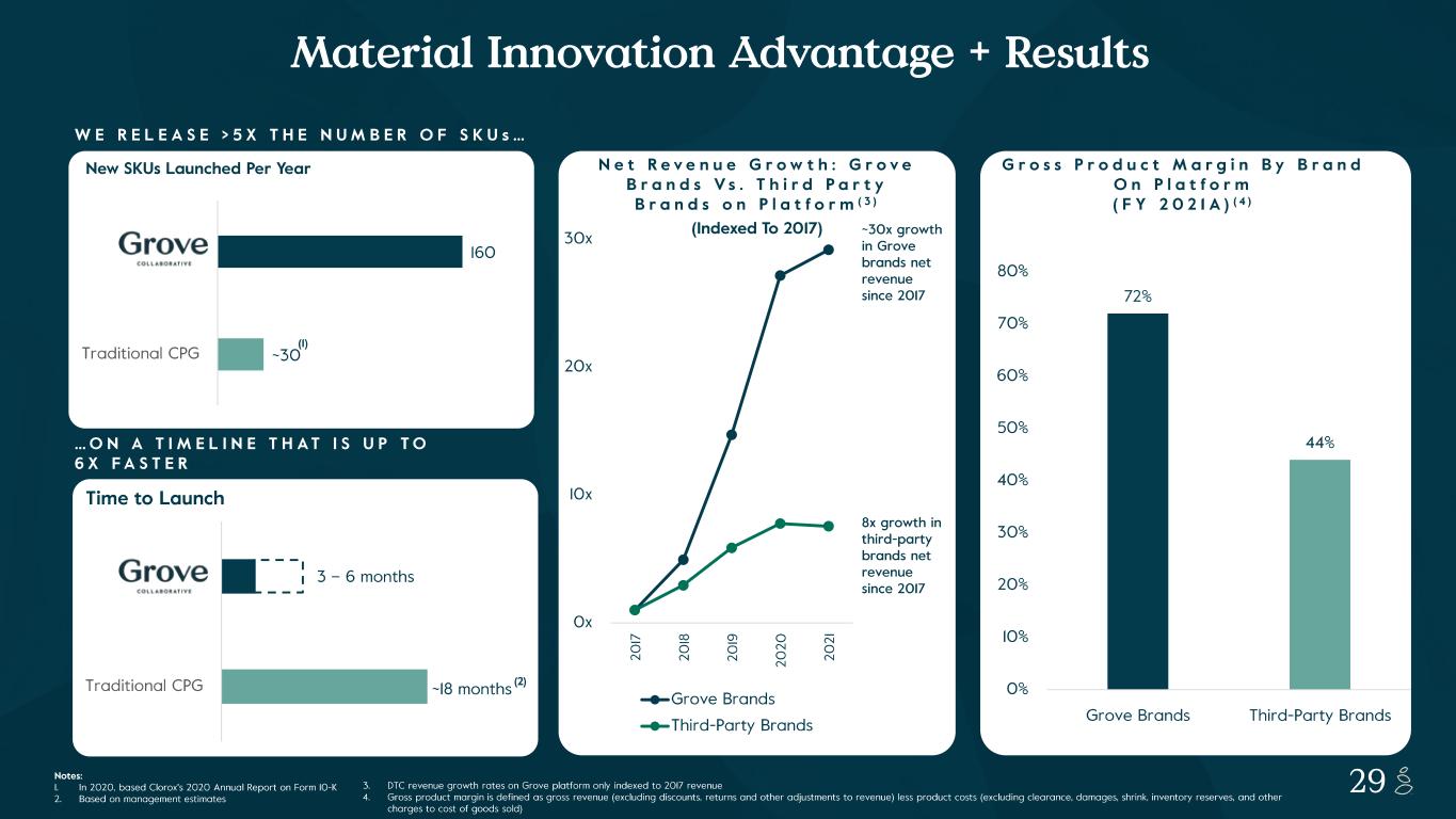 NOTES START FROM HERE AND GROW UP CONTENT BELOW THIS LINE CONTENT BELOW THIS LINE SUBTITLE BELOW THIS LINE TITLE CAN NOT GO ABOVE THIS LINE Trademarks Grove owns or has rights to various trademarks, service marks and trade names that it uses in connection with the operation of its business. This Presentation may also contain trademarks, service marks, trade names and copyrights of third parties, which are the property of their respective owners. The use or display of third parties’ trademarks, service marks, trade names or products in this Presentation is not intended to, and does not imply, a relationship with Grove, or an endorsement or sponsorship by or of Grove. Solely for convenience, the trademarks, service marks, trade names and copyrights referred to in this Presentation may appear without the TM, SM, ® or © symbols, but such references are not intended to indicate, in any way, that Grove will not assert, to the fullest extent under applicable law, its rights or the right of the applicable licensor to these trademarks, service marks, trade names and copyrights. Use of Projections This Presentation contains projected financial information with respect to Grove, namely revenue and gross margin, gross product margin, Grove brands revenue share, gross revenue share by brand, gross profit, adjusted EBITDA, adjusted EBITDA margin, fulfillment cost, operating expenses, advertising spend. Such projected financial information constitutes forward-looking information, and is for illustrative purposes only and should not be relied upon as necessarily being indicative of future results. The projections, estimates and targets in this Presentation are forward-looking statements that are based on assumptions that are inherently subject to significant uncertainties and contingencies, many of which are beyond Grove’s control. See “Forward-Looking Statements” above. While all projections, estimates and targets are necessarily speculative, Grove believes that the preparat ion of prospective financial information involves increasingly higher levels of uncertainty the further out the projection, estimate or target extends from the date of preparation. The assumptions and estimates underlying the projected, expected or target results are inherently uncertain and are subject to a wide variety of significant business, economic, regulatory, competitive and other risks and uncertainties that could cause actual results to differ materially from those contained in such projections, estimates and targets. The inclusion of projections, estimates and targets in this Presentation should not be regarded as an indication that Grove, or its representatives, considered or consider the financial projections, estimates and targets to be a reliable prediction of future events. The independent registered public accounting firm of Grove has not audited, reviewed, compiled or performed any procedures with respect to the projections for the purpose of their inclusion in this Presentation, and accordingly, neither of them expressed an opinion or provided any other form of assurance with respect thereto for the purpose of this Presentation. Financial Information; Non-GAAP Financial Measures The Grove financial information and data for the fiscal years ended December 31, 2019, 2020 and 2021 included herein are audited in accordance with Association of International Certified Professional Accountants (AICPA) auditing standards. Some of the financial information and data contained in this Presentation, such as gross product margin, contribution profit and adjusted EBITDA, have not been prepared in accordance with United States generally accepted accounting principles (“GAAP”). These non-GAAP measures, and other measures that are calculated using such non-GAAP measures, are an addition to, and not a substitute for or superior to, measures of financial performance prepared in accordance with GAAP and should not be considered as an alternative to revenue, operating income, profit before tax, net income or any other performance measures derived in accordance with GAAP. A reconciliation of adjusted EBITDA to Net Income is provided at the end of this presentation. A reconciliation of the projected non-GAAP financial measures has not been provided and is unable to be provided without unreasonable effort because certain items excluded from these non-GAAP financial measures such as charges related to stock-based compensation expenses and related tax effects, including non-recurring income tax adjustments, cannot be reasonably calculated or predicted at this time. Grove believes these non-GAAP measures of financial results, including on a forward-looking basis, provide useful information to management and investors regarding certain financial and business trends relating to Grove’s financial condition and results of operations. Grove’s management uses these non-GAAP measures for trend analyses and for budgeting and planning purposes. Grove believes that the use of these non-GAAP financial measures provide an additional tool for investors to use in evaluating projected operating results and trends in and in comparing Grove’s financial measures with other similar companies, many of which present similar non-GAAP financial measures to investors. However, there are a number of limitations related to the use of these non-GAAP measures and their nearest GAAP equivalents. For example, other companies may calculate non-GAAP measures differently, or may use other measures to calculate their financial performance, and therefore Grove’s non-GAAP measures may not be directly comparable to similarly titled measures of other companies. See the footnotes on the slides where these measures are discussed and the Appendix for definitions of these non-GAAP financial measures and reconciliations of these non-GAAP financial measures to the most directly comparable GAAP measures. Important Information for Investors and Stockholders This 