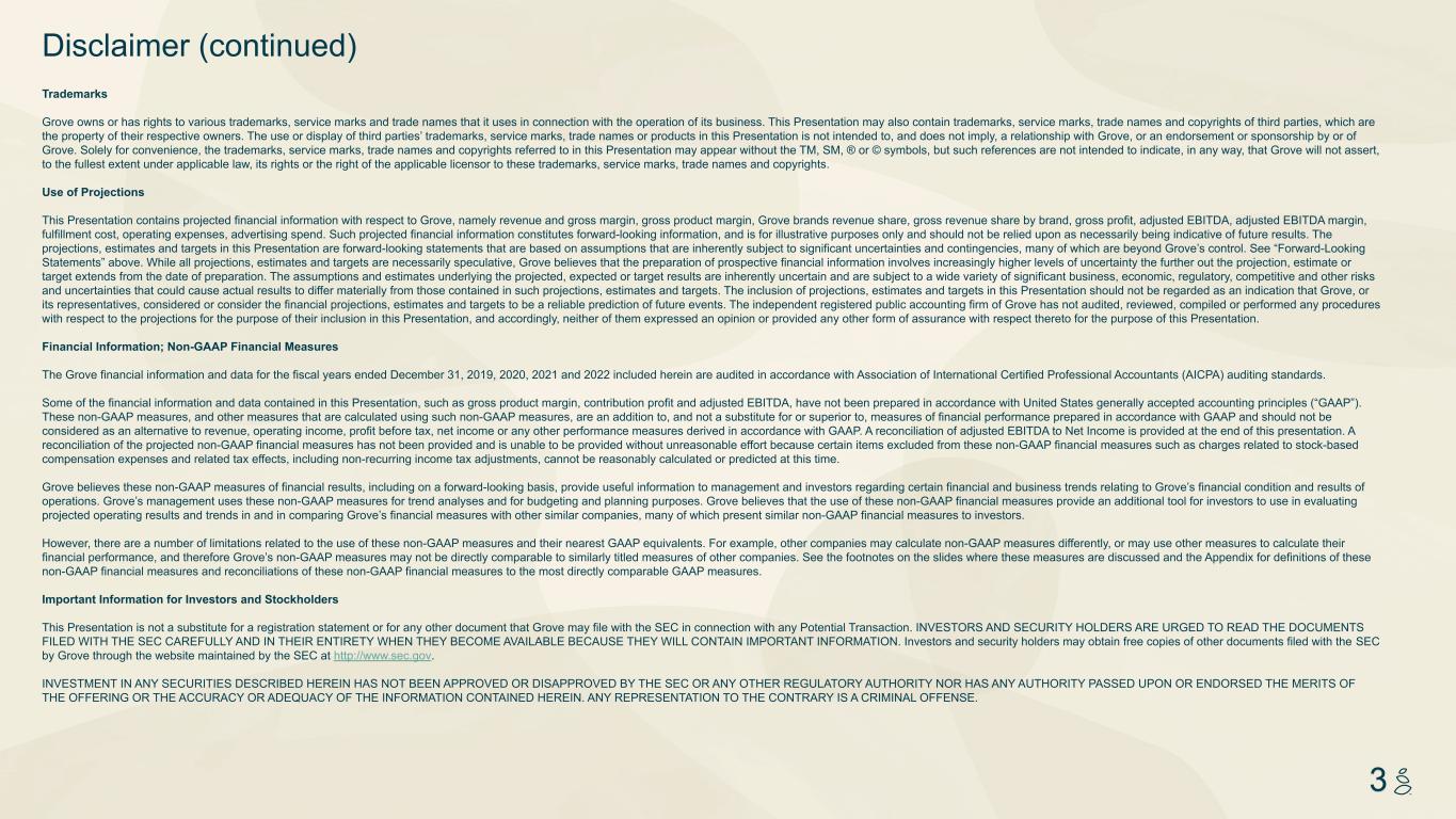 NOTES START FROM HERE AND GROW UP NO CONTENT BELOW THIS LINE CONTENT BELOW THIS LINE SUBTITLE BELOW THIS LINE TITLE CAN NOT GO ABOVE THIS LINE 3 59 76 0 114 88 120 159 144 130 186 128 102 163 157 172 196 200 255 255 255 0 0 0 247 243 228 3 59 76 247 243 228 3 Trademarks Grove owns or has rights to various trademarks, service marks and trade names that it uses in connection with the operation of its business. This Presentation may also contain trademarks, service marks, trade names and copyrights of third parties, which are the property of their respective owners. The use or display of third parties’ trademarks, service marks, trade names or products in this Presentation is not intended to, and does not imply, a relationship with Grove, or an endorsement or sponsorship by or of Grove. Solely for convenience, the trademarks, service marks, trade names and copyrights referred to in this Presentation may appear without the TM, SM, ® or © symbols, but such references are not intended to indicate, in any way, that Grove will not assert, to the fullest extent under applicable law, its rights or the right of the applicable licensor to these trademarks, service marks, trade names and copyrights. Use of Projections This Presentation contains projected financial information with respect to Grove, namely revenue and gross margin, gross product margin, Grove brands revenue share, gross revenue share by brand, gross profit, adjusted EBITDA, adjusted EBITDA margin, fulfillment cost, operating expenses, advertising spend. Such projected financial information constitutes forward-looking information, and is for illustrative purposes only and should not be relied upon as necessarily being indicative of future results. The projections, estimates and targets in this Presentation are forward-looking statements that are based on assumptions that are inherently subject to significant uncertainties and contingencies, many of which are beyond Grove’s control. See “Forward-Looking Statements” above. While all projections, estimates and targets are necessarily speculative, Grove believes that the preparation of prospective financial information involves increasingly higher levels of uncertainty the further out the projection, estimate or target extends from the date of preparation. The assumptions and estimates underlying the projected, expected or target results are inherently uncertain and are subject to a wide variety of significant business, economic, regulatory, competitive and other risks and uncertainties that could cause actual results to differ materially from those contained in such projections, estimates and targets. The inclusion of projections, estimates and targets in this Presentation should not be regarded as an indication that Grove, or its representatives, considered or consider the financial projections, estimates and targets to be a reliable prediction of future events. The independent registered public accounting firm of Grove has not audited, reviewed, compiled or performed any procedures with respect to the projections for the purpose of their inclusion in this Presentation, and accordingly, neither of them expressed an opinion or provided any other form of assurance with respect thereto for the purpose of this Presentation. Financial Information; Non-GAAP Financial Measures The Grove financial information and data for the fiscal years ended December 31, 2019, 2020, 2021 and 2022 included herein are audited in accordance with Association of International Certified Professional Accountants (AICPA) auditing standards. Some of the financial information and data contained in this Presentation, such as gross product margin, contribution profit and adjusted EBITDA, have not been prepared in accordance with United States generally accepted accounting principles (“GAAP”). These non-GAAP measures, and other measures that are calculated using such non-GAAP measures, are an addition to, and not a substitute for or superior to, measures of financial performance prepared in accordance with GAAP and should not be considered as an alternative to revenue, operating income, profit before tax, net income or any other performance measures derived in accordance with GAAP. A reconciliation of adjusted EBITDA to Net Income is provided at the end of this presentation. A reconciliation of the projected non-GAAP financial measures has not been provided and is unable to be provided without unreasonable effort because certain items excluded from these non-GAAP financial measures such as charges related to stock-based compensation expenses and related tax effects, including non-recurring income tax adjustments, cannot be reasonably calculated or predicted at this time. Grove believes these non-GAAP measures of financial results, including on a forward-looking basis, provide useful information to management and investors regarding certain financial and business trends relating to Grove’s financial condition and results of operations. Grove’s management uses these non-GAAP measures for trend analyses and for budgeting and planning purposes. Grove believes that the use of these non-GAAP financial measures provide an additional tool for investors to use in evaluating projected operating results and trends in and in comparing Grove’s financial measures with other similar companies, many of which present similar non-GAAP financial measures to investors. However, there are a number of limitations related to the use of these non-GAAP measures and their nearest GAAP equivalents. For example, other companies may calculate non-GAAP measures differently, or may use other measures to calculate their financial performance, and therefore Grove’s non-GAAP measures may not be directly comparable to similarly titled measures of other companies. See the footnotes on the slides where these measures are discussed and the Appendix for definitions of these non-GAAP financial measures and reconciliations of these non-GAAP