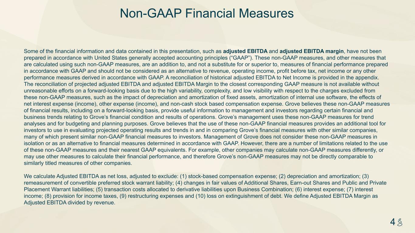 NOTES START FROM HERE AND GROW UP NO CONTENT BELOW THIS LINE CONTENT BELOW THIS LINE SUBTITLE BELOW THIS LINE TITLE CAN NOT GO ABOVE THIS LINE 3 59 76 0 114 88 120 159 144 130 186 128 102 163 157 172 196 200 255 255 255 0 0 0 247 243 228 3 59 76 247 243 228 4 Non-GAAP Financial Measures Some of the financial information and data contained in this presentation, such as adjusted EBITDA and adjusted EBITDA margin, have not been prepared in accordance with United States generally accepted accounting principles (“GAAP”). These non-GAAP measures, and other measures that are calculated using such non-GAAP measures, are an addition to, and not a substitute for or superior to, measures of financial performance prepared in accordance with GAAP and should not be considered as an alternative to revenue, operating income, profit before tax, net income or any other performance measures derived in accordance with GAAP. A reconciliation of historical adjusted EBITDA to Net Income is provided in the appendix. The reconciliation of projected adjusted EBITDA and adjusted EBITDA Margin to the closest corresponding GAAP measure is not available without unreasonable efforts on a forward-looking basis due to the high variability, complexity, and low visibility with respect to the charges excluded from these non-GAAP measures, such as the impact of depreciation and amortization of fixed assets, amortization of internal use software, the effects of net interest expense (income), other expense (income), and non-cash stock based compensation expense. Grove believes these non-GAAP measures of financial results, including on a forward-looking basis, provide useful information to management and investors regarding certain financial and business trends relating to Grove’s financial condition and results of operations. Grove’s management uses these non-GAAP measures for trend analyses and for budgeting and planning purposes. Grove believes that the use of these non-GAAP financial measures provides an additional tool for investors to use in evaluating projected operating results and trends in and in comparing Grove’s financial measures with other similar companies, many of which present similar non-GAAP financial measures to investors. Management of Grove does not consider these non-GAAP measures in isolation or as an alternative to financial measures determined in accordance with GAAP. However, there are a number of limitations related to the use of these non-GAAP measures and their nearest GAAP equivalents. For example, other companies may calculate non-GAAP measures differently, or may use other measures to calculate their financial performance, and therefore Grove’s non-GAAP measures may not be directly comparable to similarly titled measures of other companies. We calculate Adjusted EBITDA as net loss, adjusted to exclude: (1) stock-based compensation expense; (2) depreciation and amortization; (3) remeasurement of convertible preferred stock warrant liability; (4) changes in fair values of Additional Shares, Earn-out Shares and Public and Private Placement Warrant liabilities; (5) transaction costs allocated to derivative liabilities upon Business Combination; (6) interest expense; (7) interest income; (8) provision for income taxes, (9) restructuring expenses and (10) loss on extinguishment of debt. We define Adjusted EBITDA Margin as Adjusted EBITDA divided by revenue.