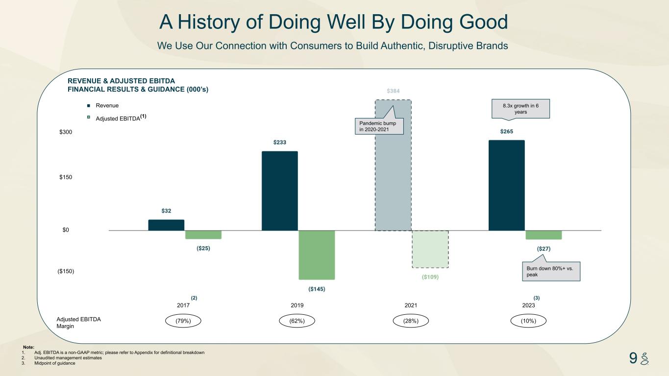 NOTES START FROM HERE AND GROW UP NO CONTENT BELOW THIS LINE CONTENT BELOW THIS LINE SUBTITLE BELOW THIS LINE TITLE CAN NOT GO ABOVE THIS LINE 3 59 76 0 114 88 120 159 144 130 186 128 102 163 157 172 196 200 255 255 255 0 0 0 247 243 228 3 59 76 247 243 228 9 A History of Doing Well By Doing Good We Use Our Connection with Consumers to Build Authentic, Disruptive Brands Note: 1. Adj. EBITDA is a non-GAAP metric; please refer to Appendix for definitional breakdown 2. Unaudited management estimates 3. Midpoint of guidance Revenue Adjusted EBITDA(1) 8.3x growth in 6 years REVENUE & ADJUSTED EBITDA FINANCIAL RESULTS & GUIDANCE (000’s) Pandemic bump in 2020-2021 (2) (3) $300 $150 $0 ($150) Burn down 80%+ vs. peak 2017 2019 2021 2023 (79%)Adjusted EBITDA Margin (62%) (28%) (10%)