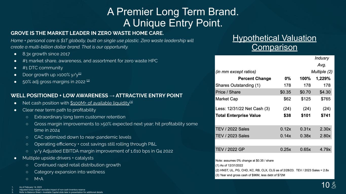 NOTES START FROM HERE AND GROW UP NO CONTENT BELOW THIS LINE CONTENT BELOW THIS LINE SUBTITLE BELOW THIS LINE TITLE CAN NOT GO ABOVE THIS LINE 3 59 76 0 114 88 120 159 144 130 186 128 102 163 157 172 196 200 255 255 255 0 0 0 247 243 228 3 59 76 247 243 228 10 GROVE IS THE MARKET LEADER IN ZERO WASTE HOME CARE. Home + personal care is $1T globally, built on single use plastic. Zero waste leadership will create a multi-billion dollar brand. That is our opportunity. ● 8.3x growth since 2017 ● #1 market share, awareness, and assortment for zero waste HPC ● #1 DTC community ● Door growth up >100% y/y(1) ● 50% adj gross margins in 2022 (2) WELL POSITIONED + LOW AWARENESS → ATTRACTIVE ENTRY POINT ● Net cash position with $100M+ of available liquidity(3) ● Clear near term path to profitability ○ Extraordinary long term customer retention ○ Gross margin improvements to >50% expected next year; hit profitability some time in 2024 ○ CAC optimized down to near-pandemic levels ○ Operating efficiency + cost savings still rolling through P&L ○ y/y Adjusted EBITDA margin improvement of 1,610 bps in Q4 2022 ● Multiple upside drivers + catalysts ○ Continued rapid retail distribution growth ○ Category expansion into wellness ○ M+A A Premier Long Term Brand. A Unique Entry Point. Hypothetical Valuation Comparison 1. As of February 14, 2023 2. Adjusted Gross margin excludes impact of non-cash inventory reserve 3. Refer to Balance Sheet + Available Capital slide later in presentation for additional details