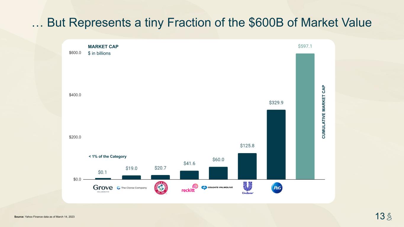 NOTES START FROM HERE AND GROW UP NO CONTENT BELOW THIS LINE CONTENT BELOW THIS LINE SUBTITLE BELOW THIS LINE TITLE CAN NOT GO ABOVE THIS LINE 3 59 76 0 114 88 120 159 144 130 186 128 102 163 157 172 196 200 255 255 255 0 0 0 247 243 228 3 59 76 247 243 228 13Source: Yahoo Finance data as of March 14, 2023 … But Represents a tiny Fraction of the $600B of Market Value < 1% of the Category C U M U LA TI VE M A R K ET C A P MARKET CAP $ in billions