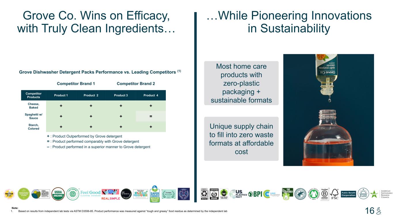 NOTES START FROM HERE AND GROW UP NO CONTENT BELOW THIS LINE CONTENT BELOW THIS LINE SUBTITLE BELOW THIS LINE TITLE CAN NOT GO ABOVE THIS LINE 3 59 76 0 114 88 120 159 144 130 186 128 102 163 157 172 196 200 255 255 255 0 0 0 247 243 228 3 59 76 247 243 228 16 Grove Co. Wins on Efficacy, with Truly Clean Ingredients… Grove Dishwasher Detergent Packs Performance vs. Leading Competitors (1) Competitor Brand 1 Competitor Brand 2 Competitor Products Product 1 Product 2 Product 3 Product 4 Cheese, Baked + + + + Spaghetti w/ Sauce + + + = Starch, Colored + + + + + : Product Outperformed by Grove detergent = : Product performed comparably with Grove detergent – : Product performed in a superior manner to Grove detergent Note: 1. Based on results from independent lab tests via ASTM D3556-85. Product performance was measured against “tough and greasy” food residue as determined by the independent lab …While Pioneering Innovations in Sustainability Unique supply chain to fill into zero waste formats at affordable cost Most home care products with zero-plastic packaging + sustainable formats
