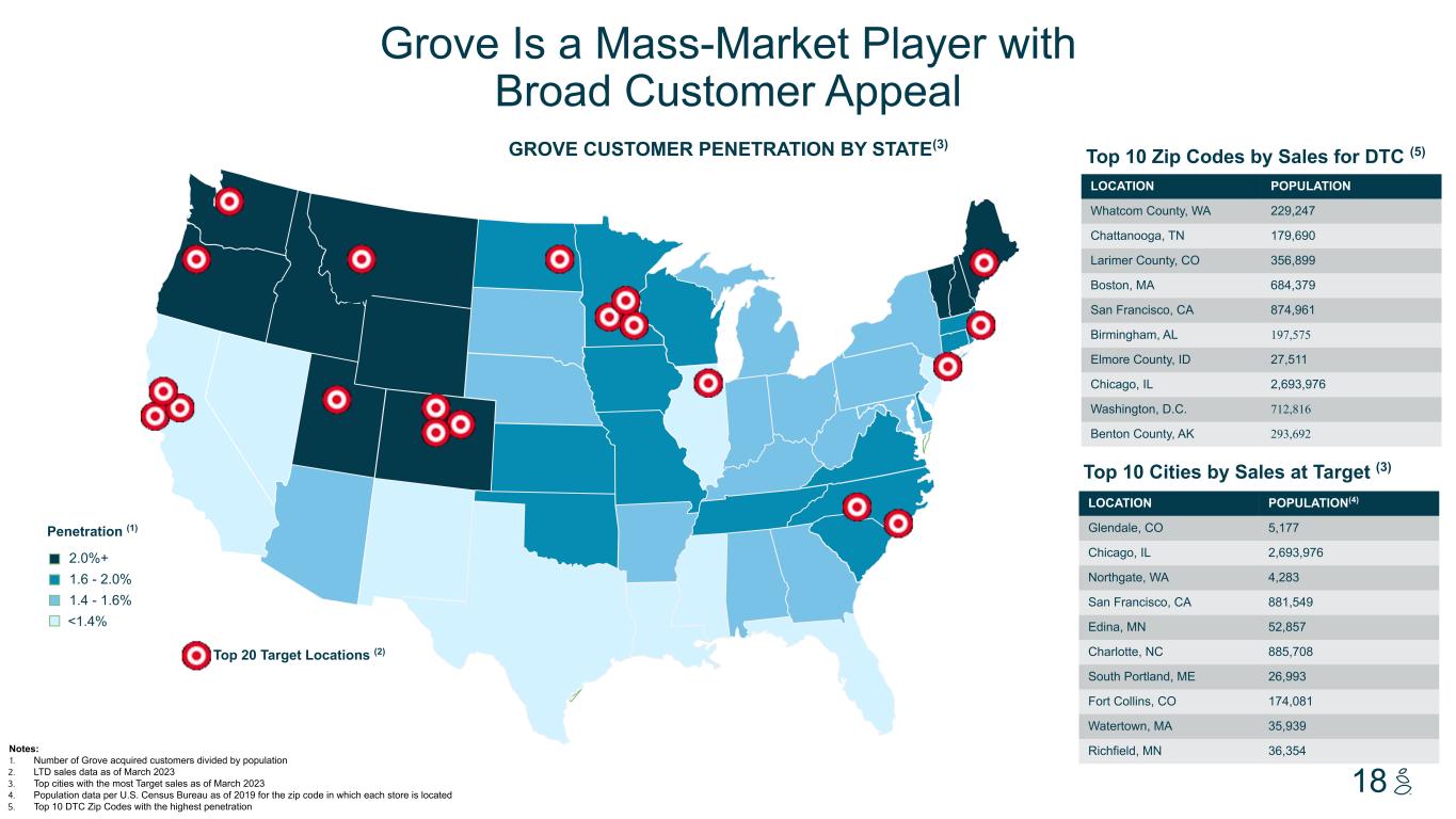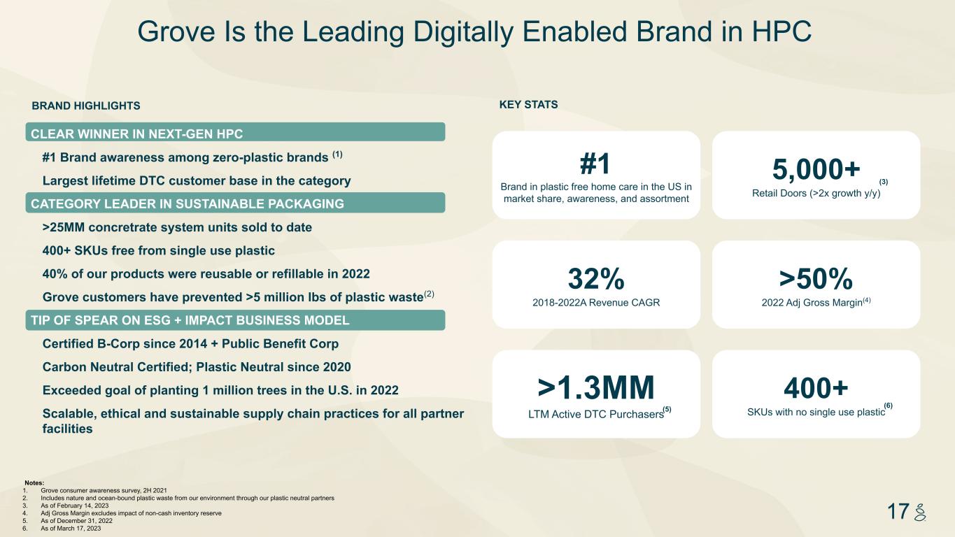 NOTES START FROM HERE AND GROW UP NO CONTENT BELOW THIS LINE CONTENT BELOW THIS LINE SUBTITLE BELOW THIS LINE TITLE CAN NOT GO ABOVE THIS LINE 3 59 76 0 114 88 120 159 144 130 186 128 102 163 157 172 196 200 255 255 255 0 0 0 247 243 228 3 59 76 247 243 228 17 CLEAR WINNER IN NEXT-GEN HPC #1 Brand awareness among zero-plastic brands (1) Largest lifetime DTC customer base in the category CATEGORY LEADER IN SUSTAINABLE PACKAGING >25MM concretrate system units sold to date 400+ SKUs free from single use plastic 40% of our products were reusable or refillable in 2022 Grove customers have prevented >5 million lbs of plastic waste(2) TIP OF SPEAR ON ESG + IMPACT BUSINESS MODEL Certified B-Corp since 2014 + Public Benefit Corp Carbon Neutral Certified; Plastic Neutral since 2020 Exceeded goal of planting 1 million trees in the U.S. in 2022 Scalable, ethical and sustainable supply chain practices for all partner facilities Grove Is the Leading Digitally Enabled Brand in HPC 32% 2018-2022A Revenue CAGR >1.3MM LTM Active DTC Purchasers >50% 2022 Adj Gross Margin(4) #1 Brand in plastic free home care in the US in market share, awareness, and assortment 400+ SKUs with no single use plastic 5,000+ Retail Doors (>2x growth y/y) KEY STATSBRAND HIGHLIGHTS Notes: 1. Grove consumer awareness survey, 2H 2021 2. Includes nature and ocean-bound plastic waste from our environment through our plastic neutral partners 3. As of February 14, 2023 4. Adj Gross Margin excludes impact of non-cash inventory reserve 5. As of December 31, 2022 6. As of March 17, 2023 (3) (5) (6)