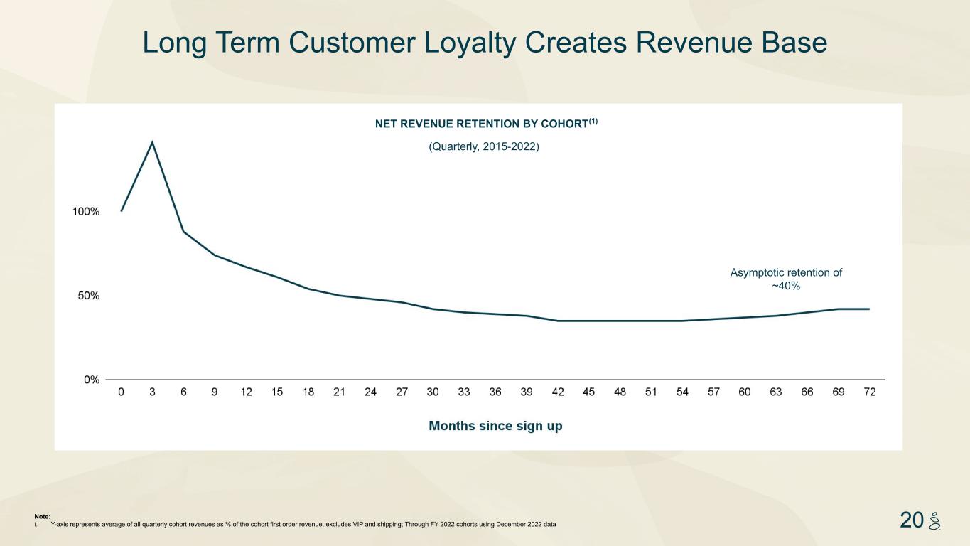 NOTES START FROM HERE AND GROW UP NO CONTENT BELOW THIS LINE CONTENT BELOW THIS LINE SUBTITLE BELOW THIS LINE TITLE CAN NOT GO ABOVE THIS LINE 3 59 76 0 114 88 120 159 144 130 186 128 102 163 157 172 196 200 255 255 255 0 0 0 247 243 228 3 59 76 247 243 228 20Note: 1. Y-axis represents average of all quarterly cohort revenues as % of the cohort first order revenue, excludes VIP and shipping; Through FY 2022 cohorts using December 2022 data NET REVENUE RETENTION BY COHORT(1) (Quarterly, 2015-2022) Long Term Customer Loyalty Creates Revenue Base Asymptotic retention of ~40%