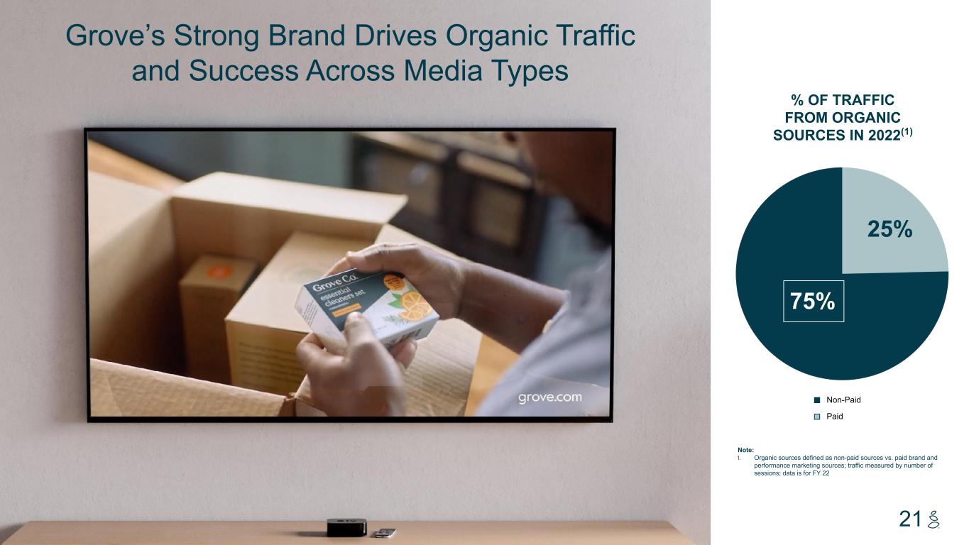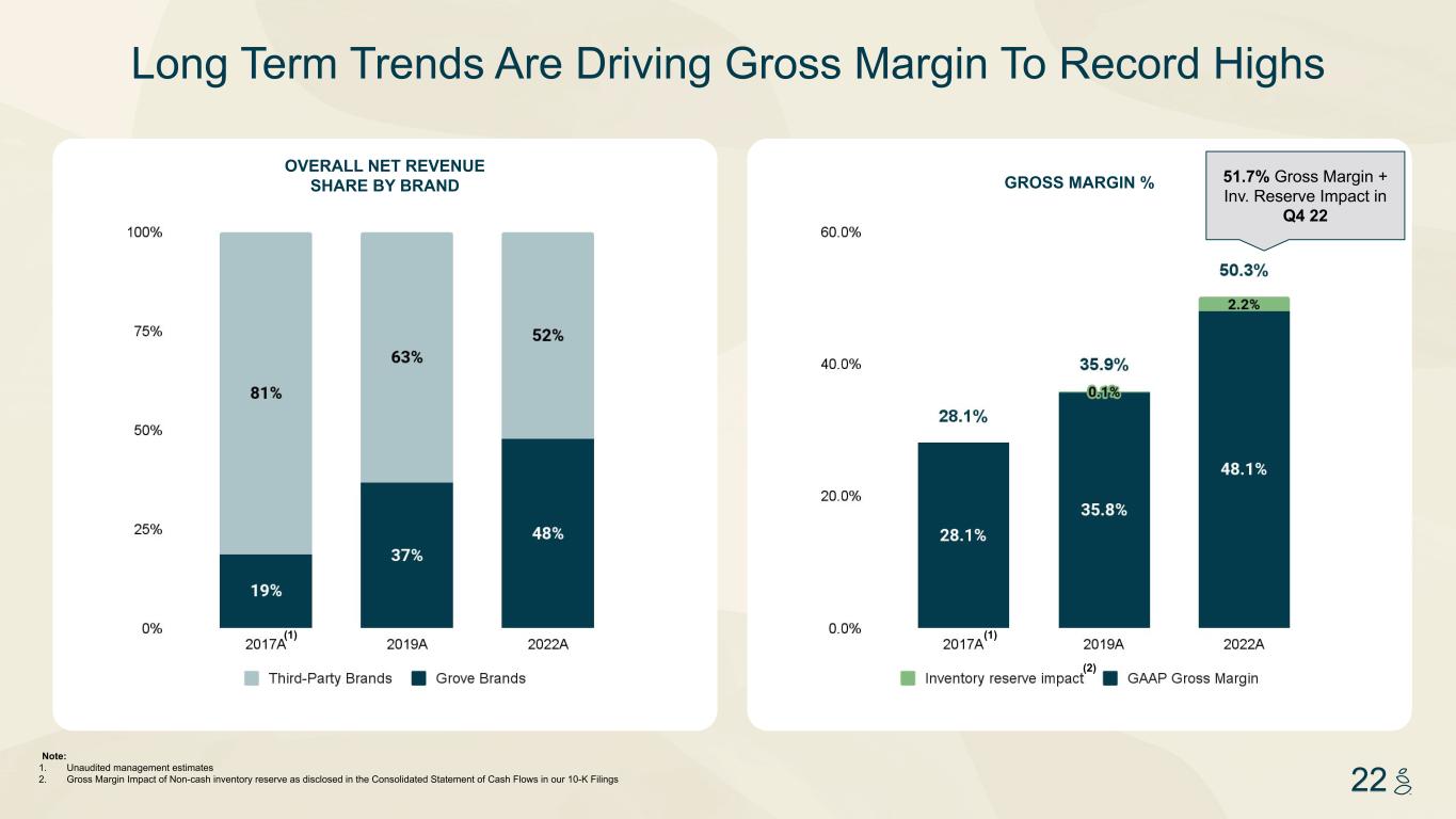 NOTES START FROM HERE AND GROW UP NO CONTENT BELOW THIS LINE CONTENT BELOW THIS LINE SUBTITLE BELOW THIS LINE TITLE CAN NOT GO ABOVE THIS LINE 3 59 76 0 114 88 120 159 144 130 186 128 102 163 157 172 196 200 255 255 255 0 0 0 247 243 228 3 59 76 247 243 228 21 % OF TRAFFIC FROM ORGANIC SOURCES IN 2022(1) Grove’s Strong Brand Drives Organic Traffic and Success Across Media Types 21 Note: 1. Organic sources defined as non-paid sources vs. paid brand and performance marketing sources; traffic measured by number of sessions; data is for FY 22 75% Non-Paid Paid 25%