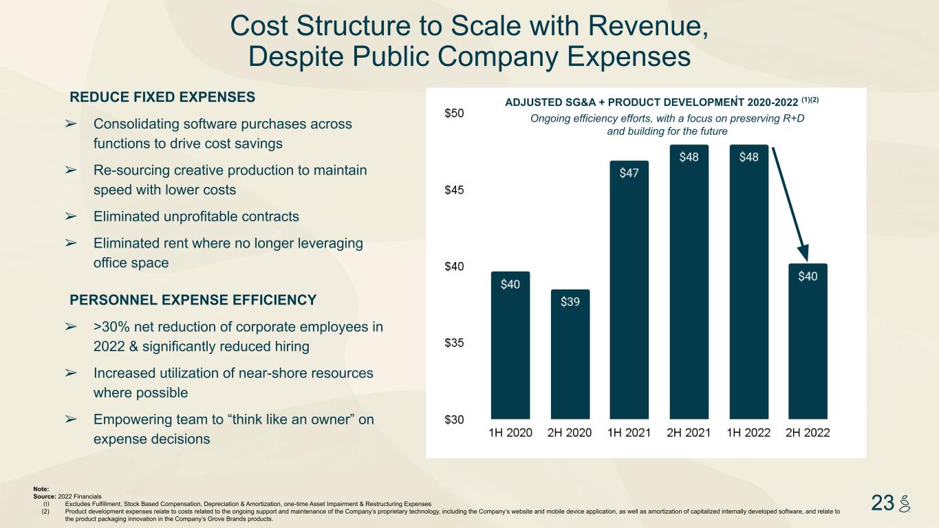 NOTES START FROM HERE AND GROW UP NO CONTENT BELOW THIS LINE CONTENT BELOW THIS LINE SUBTITLE BELOW THIS LINE TITLE CAN NOT GO ABOVE THIS LINE 3 59 76 0 114 88 120 159 144 130 186 128 102 163 157 172 196 200 255 255 255 0 0 0 247 243 228 3 59 76 247 243 228 23 REDUCE FIXED EXPENSES ➢ Consolidating software purchases across functions to drive cost savings ➢ Re-sourcing creative production to maintain speed with lower costs ➢ Eliminated unprofitable contracts ➢ Eliminated rent where no longer leveraging office space PERSONNEL EXPENSE EFFICIENCY ➢ >30% net reduction of corporate employees in 2022 & significantly reduced hiring ➢ Increased utilization of near-shore resources where possible ➢ Empowering team to “think like an owner” on expense decisions Cost Structure to Scale with Revenue, Despite Public Company Expenses Note: Source: 2022 Financials (1) Excludes Fulfillment, Stock Based Compensation, Depreciation & Amortization, one-time Asset Impairment & Restructuring Expenses (2) Product development expenses relate to costs related to the ongoing support and maintenance of the Company’s proprietary technology, including the Company’s website and mobile device application, as well as amortization of capitalized internally developed software, and relate to the product packaging innovation in the Company’s Grove Brands products. ADJUSTED SG&A + PRODUCT DEVELOPMENT 2020-2022 (1)(2)1 Ongoing efficiency efforts, with a focus on preserving R+D and building for the future