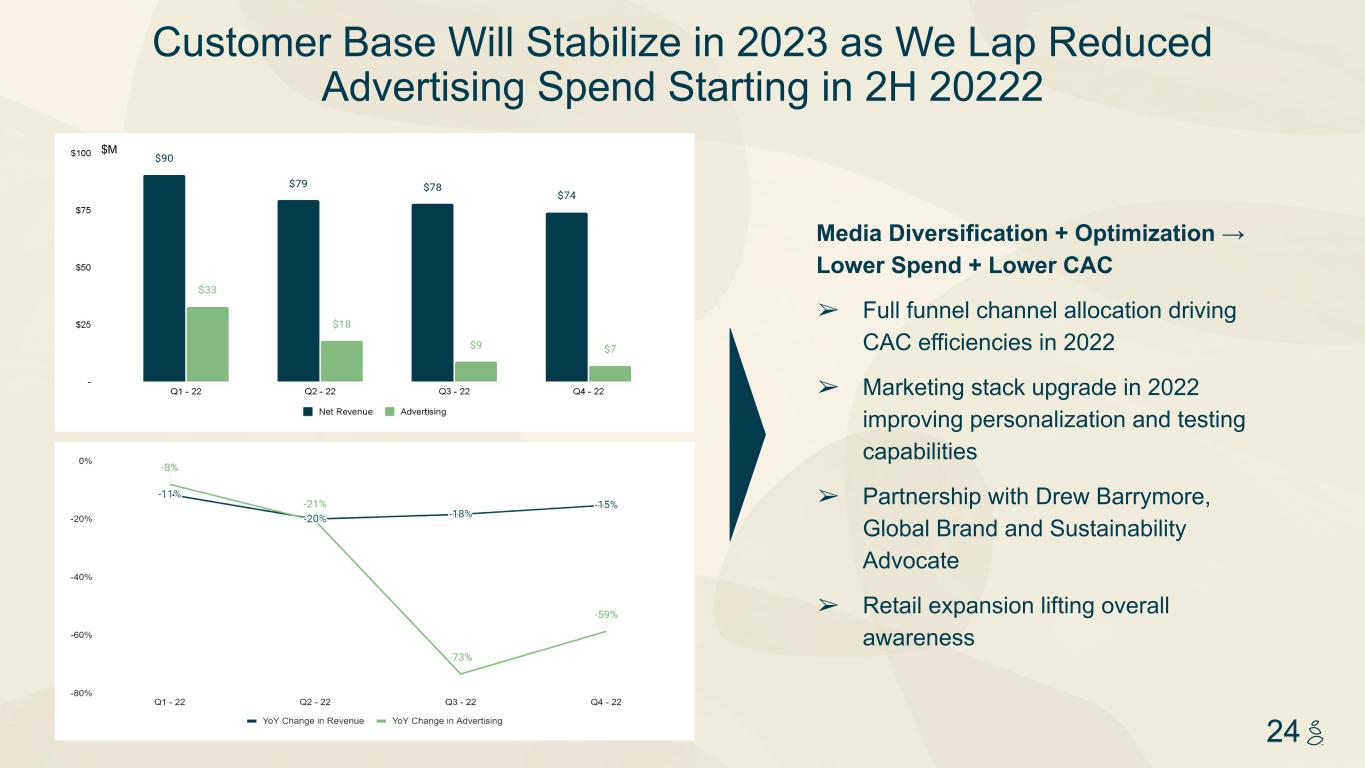 NOTES START FROM HERE AND GROW UP NO CONTENT BELOW THIS LINE CONTENT BELOW THIS LINE SUBTITLE BELOW THIS LINE TITLE CAN NOT GO ABOVE THIS LINE 3 59 76 0 114 88 120 159 144 130 186 128 102 163 157 172 196 200 255 255 255 0 0 0 247 243 228 3 59 76 247 243 228 24 Customer Base Will Stabilize in 2023 as We Lap Reduced Advertising Spend Starting in 2H 20222 Media Diversification + Optimization → Lower Spend + Lower CAC ➢ Full funnel channel allocation driving CAC efficiencies in 2022 ➢ Marketing stack upgrade in 2022 improving personalization and testing capabilities ➢ Partnership with Drew Barrymore, Global Brand and Sustainability Advocate ➢ Retail expansion lifting overall awareness $M