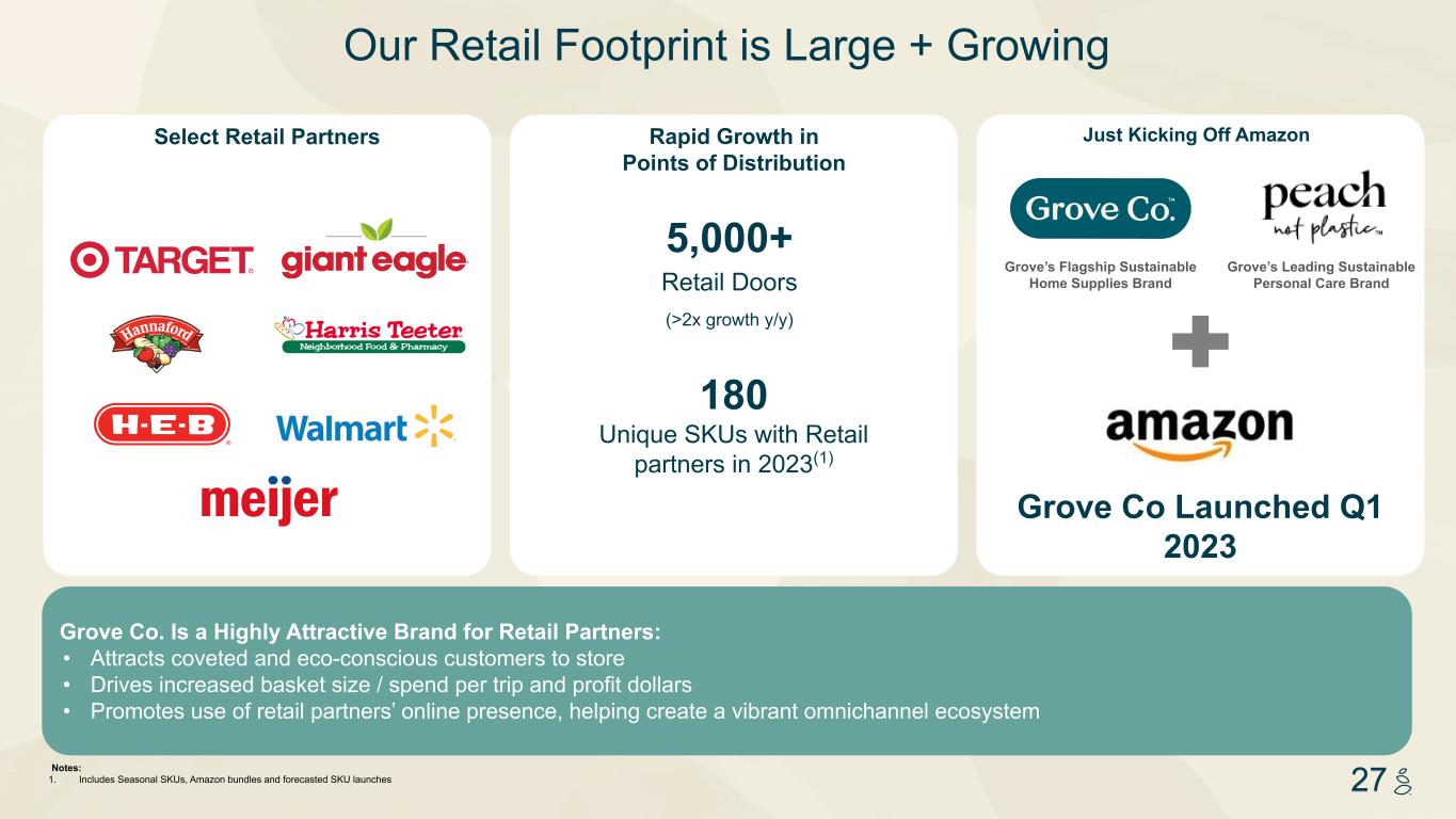 NOTES START FROM HERE AND GROW UP NO CONTENT BELOW THIS LINE CONTENT BELOW THIS LINE SUBTITLE BELOW THIS LINE TITLE CAN NOT GO ABOVE THIS LINE 3 59 76 0 114 88 120 159 144 130 186 128 102 163 157 172 196 200 255 255 255 0 0 0 247 243 228 3 59 76 247 243 228 26 Bringing Grove Co. to Retail Distribution is a Game Changing Opportunity Sources: 1. Per Euromonitor International Ltd, Beauty & Personal Care 2022ed, Home Care 2022ed, Pet Care 2022ed, Consumer Health 2022ed, and Tissue & Hygiene 2022ed; aggregation of beauty, personal care, home care, pet care (excluding food), baby care (diapers and wipes), and vitamins and dietary supplements 2. Management estimates developed from a variety of third-party resources CURRENT SALES CHANNEL U.S. Vertical HPC eCommerce Sales: <$20.0Bn (2) 2021-2025 FOCUS $180Bn (1) U.S. HPC Retail Industry 2023-2030 FOCUS ~$1 Trillion (1) Global HPC Retail Industry The Retail Opportunity is Still Early Days